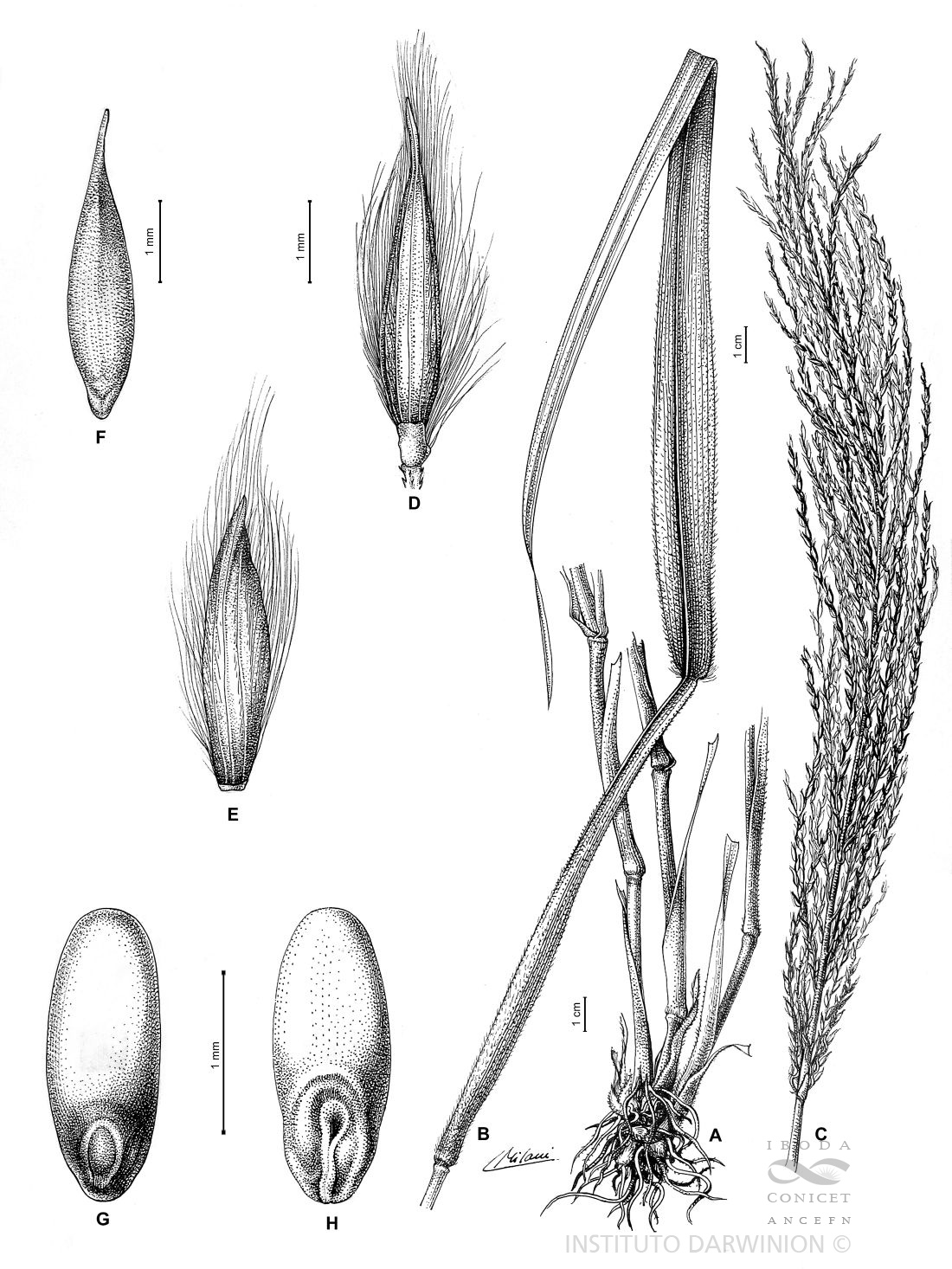 A. Porción del vástago con rizomas. B. Hoja. C. Inflorescencia. D. Espiguilla vista ventral. E. Gluma superior vista dorsal. F. Antecio superior vista dorsal. G. Cariopsis vista hilar. H. Cariopsis vista escutelar.