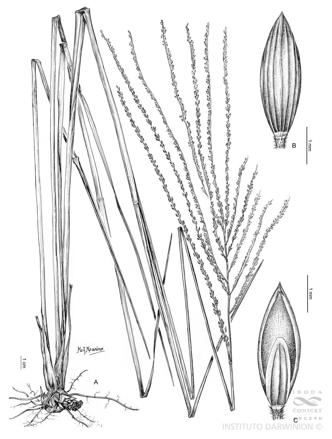 A. Planta. B. Espiguilla vista ventral. C. Espiguilla vista dorsal