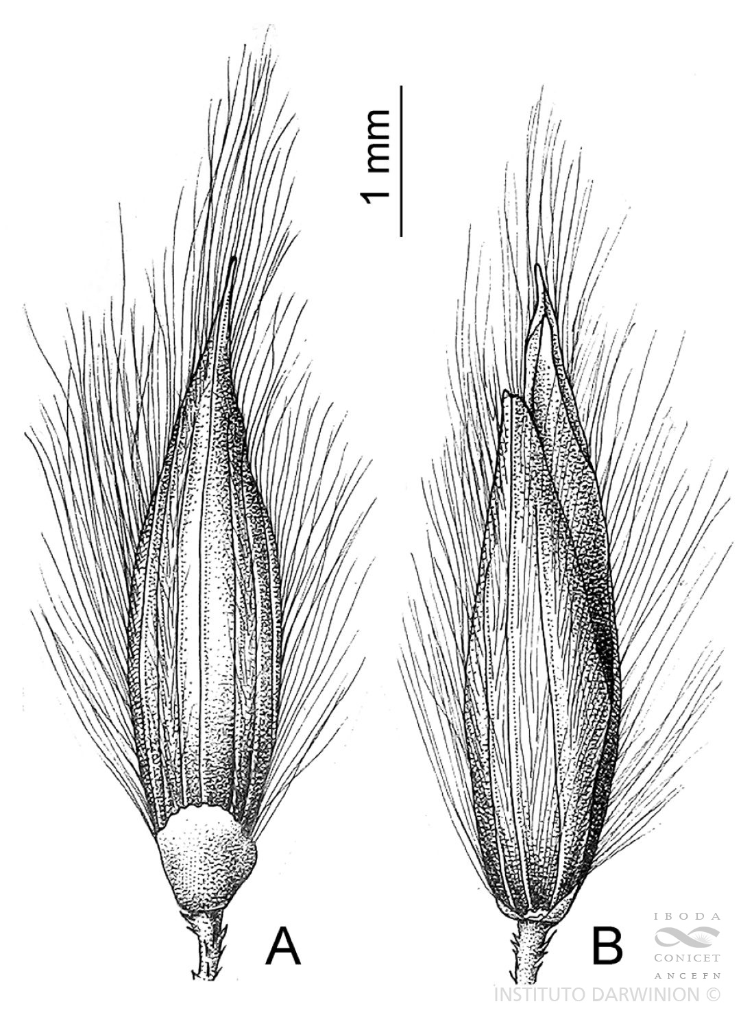 Plantas perennes de 30-100 cm de alto, cespitosas, con rizomas cortos, abultados, cubiertos de catáfilos pubescentes; cañas de 0,3-0,5 mm de diámetro, erectas; nudos castaños, glabros; vainas de 3-20 cm x 2-7 mm, glabras, excepcionalmente pubescentes; lígulas de 1,5-2 mm de largo, membranáceas, triangulares, margen dentado; láminas de 6-15 cm x 1,5-8(-10) mm, planas, glabras o pubescentes. Panícula de 11-25 cm de largo, con 4-14 racimos alternos o verticilados sobre un eje cuadrangular, escabroso; pedicelos trígonos, escabrosos. Espiguillas de 4-5,5 x 1,3-1,4 mm, binadas, pilosas; indumento lanoso, pelos ocráceos, largos y sedosos; gluma inferior de 0,5-0,7 mm de largo, membranácea, obtusa, margen hialino; gluma superior de 3-4,5 x 0,9-1 mm, lanceolada, 3-nervia, pilosa, los pelos sobrepasan su longitud; lemma inferior tan larga como la espiguilla, lanceolada, acuminada, 7-nervia, glabra a ambos lados del nervio medio y alternadamente pilosa y glabra en las zonas restantes, excepcionalmente el dorso totalmente piloso; pálea inferior reducida; lodículas 1-2, de 0,25 mm de largo, libres o soldadas; antecio superior de 3,5-4,5 x 0,8-1 mm, acuminado, castaño a la madurez; lodículas 2, de 0,3-0,4 mm de largo, cordiformes; anteras de 1-1,2 mm de largo, castaño-rojizo; cariopsis de 1,7-1,8 x 0,6-0,7 mm, elipsoide, crémea; hilo aovado; embrión ca. ½ de la longitud total de la cariopsis.
