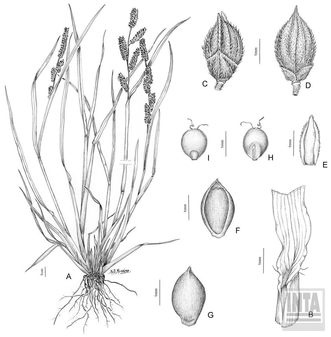 Plantas anuales, de 10-90 cm de alto; cañas erguidas a decumbentes, radicantes o no en los nudos inferiores; entrenudos de 4-16 cm de largo, glabros, cilíndricos, huecos; nudos glabros, comprimidos; vainas de 4,5-8 cm de largo, hendidas, más cortas o superando en largo a los entrenudos, glabras, lustrosas, verdosas o con tintes purpúreos, con los bordes membranáceos; lígulas ausentes; cuello glabro; láminas linear-lanceoladas, de 1,5-17 x 0,4-1 cm, planas, glabras a esparcidamente pilosas, de base subcordada y ápice atenuado, los márgenes escabriúsculos. Inflorescencias contraídas, exertas, terminales, de 1,5-17 x 1-1,5 cm; pedúnculo de 6-14 cm de largo, glabro; eje principal anguloso, glabro, escabriúsculo; 5-15 ramificaciones primarias, alternas, ascendentes, adpresas o poco divergentes; raquis primario triquetro, de 7-30 x 0,5 mm, escabroso, cortamente piloso hacia la base, terminando en una espiguilla desarrollada; espiguillas apareadas o solitarias, dispuestas en 2-4 series unilaterales; pedicelos breves, escabriúsculos. Espiguillas anchamente elipsoides a obovoides, de 2-2,7 x 1,2-1,6 mm, obtusas o mucronadas, cortamente híspidas, estipitadas; gluma superior y lemma inferior subiguales; gluma inferior aovada, de 0,9-1,5 mm de largo, ½ o poco menos del largo de la espiguilla, híspida, abrazadora, 3-nervia; gluma superior de 1,9-2,6 mm de largo, híspida, con espínulas cortas sobre los nervios, 5-7-nervia; lemma inferior glumiforme, 7-nervia; pálea inferior lanceolada, de 1,9 x 0,5 mm, glabra, membranácea, hialina, con márgenes dentados, 2-nervia; flor inferior ausente; antecio superior ovoide, de 1,9-2,4 x 1-1,4 mm, plano-convexo, pajizo, lustroso, de dorso giboso; lemma superior acuminada, escabriúscula, 5-nervia; pálea superior de ápice reflexo, libre, 2-nervia; estambres 3, anteras de aproximadamente 0,9 mm de largo; gineceo con 2 ramas libres; cariopsis ovoide, de 1,2 x 1 mm; hilo punctiforme, embrión ½ del largo de la cariopsis.