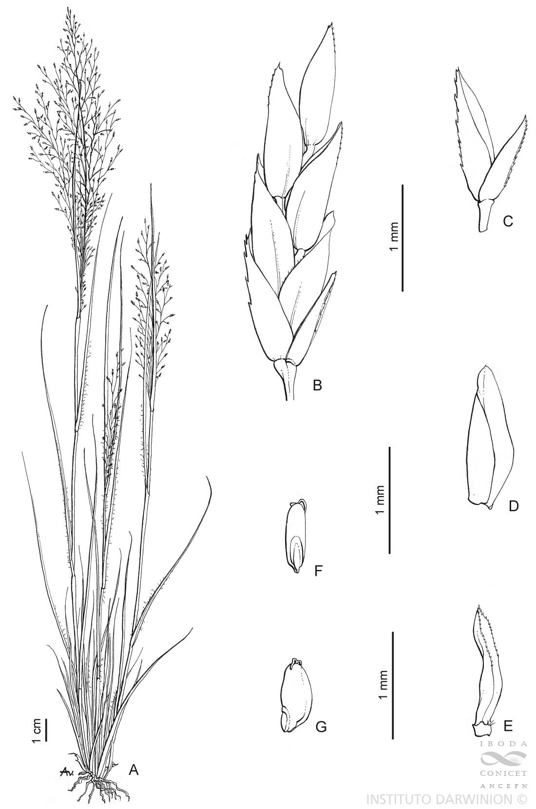 Plantas perennes, cespitosas, con innovaciones en los nudos basales; cañas de 30-70 cm de alto, erectas, algunas veces geniculadas en las porciones basales, glabras y algo brillantes debajo de los nudos; vainas ½-? del largo de los entrenudos superiores, pilosas en su porción distal y ciliadas distalmente; lígulas de 0,2-0,3 mm de largo, ciliadas; láminas de (5-)8-22 cm x 1-2 mm, involutas, raramente planas, generalmente glabras en ambas caras, escabriúsculas hacia el ápice y a lo largo de los márgenes, algunas veces con tricomas dispersos a lo largo de los márgenes, los tricomas hasta de 7 mm de largo. Inflorescencias de 16-28 x 10-21 cm, abiertas, ovadas, ramificaciones primarias ascendentes, de 6-15 cm de largo, divergentes en ángulos hasta de 100° con relación al raquis, ramificaciones escabriúsculas, sin espiguillas en su porción proximal; ramificaciones secundarias compuestas de espiguillas superpuestas; pulvínulos ciliados, los tricomas hasta de 7 mm de largo; pedicelos de 1,4-5(-7) mm de largo, erectos, rectos. Espiguillas de 2-4,5(-5) x 0,5-1,1 mm, 2-7-floras, estrechamente lanceoladas, plomizo claro a rojizo-purpúreas; desarticulación acrópeta, páleas y raquilla persistentes; glumas de 0,6-1,4 mm de largo, subiguales, ampliamente ovadas a estrechamente lanceoladas, hialinas, carinadas, escabriúsculas a lo largo de las carinas, algunas veces rojizas a purpúreas; gluma inferior de 0,6-1 mm de largo; gluma superior de 1,1-1,4 mm de largo, generalmente más ancha que la gluma inferior; lemma de 1,2-1,8 mm de largo, anchamente ovada, membranácea, márgenes distales hialinas, nervios laterales oscuros a escasamente evidentes, carinada, escabriúscula a lo largo de las carinas cerca de su porción distal, ápice agudo; pálea de 1,1-1,7 mm de largo, membranácea a parcialmente hialina, escabriúscula a lo largo de las carinas, ápice obtuso; estambres 3, anteras de 0,2-0,7 mm de largo, rojizas a purpúreas; cariopsis de 0,5-0,6 mm de largo, obovoidea a ligeramente prismática, terete a suavemente aplanada lateralmente, con un débil surco ventral, estriada y reticulada, generalmente opaca, irregularmente obovada a triangular en corte transversal, rojizo-castaña a blanquecina.