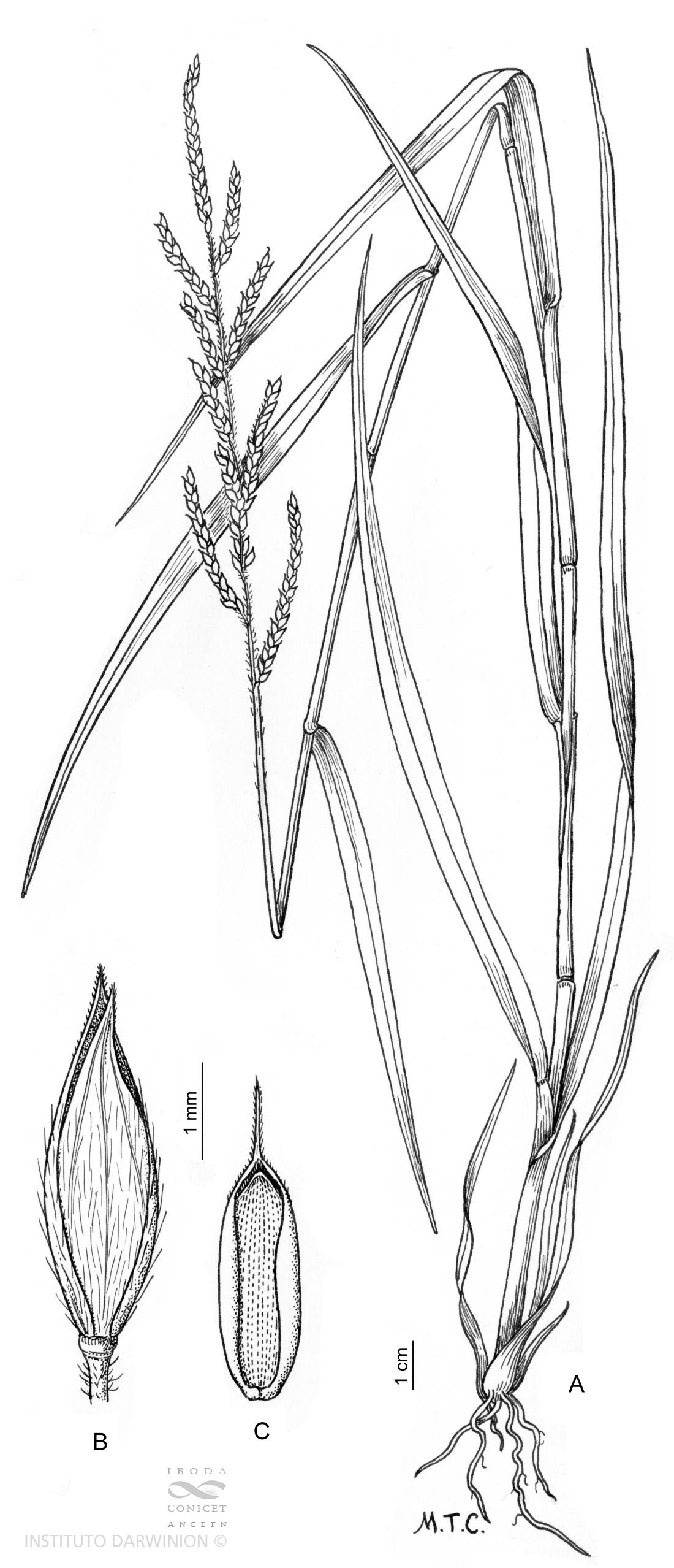 Plantas perennes, de 40-100 cm de alto, cortamente rizomatosas; cañas erectas o geniculadas en la base, con 3-10 entrenudos de 3-18 cm de largo, estriados, glabros; nudos castaños, glabros; vainas de 3-11 cm de largo, generalmente más cortas que los entrenudos, glabras o raro puberulentas, los márgenes membranáceo-ciliolados; lígulas pestañosas de 0,4-1,2 mm de largo; cuello pubescente; láminas lineares a linear-lanceoladas, planas, de 7-40 x 0,4-1 cm, glabras, márgenes escabriúsculos, ápice acuminado. Inflorescencias de 14-45 x 2-5 cm; pedúnculo terete, glabro o esparcidamente piloso; eje principal de 8-20 cm de largo, anguloso, piloso, pelos blanquecinos de hasta 1,5 mm de largo, con 7-22 ramificaciones de primer orden alternas, bilaterales, adpresas al eje o divergentes; raquis de las ramificaciones de 1,5-6 cm x 0,4-0,6 mm, triquetro, piloso, márgenes escabriúsculos; pedicelos de hasta 1,25 mm de largo, escabrosos, de ápice cupuliforme; espiguillas de a pares , una corta y la otra largamente pedicelada, o solitarias hacia el ápice. Espiguillas lanceoladas, de 4-5 x 1-1,2 mm, tempranamente caedizas, articuladas en la base junto al pedicelo; callo cupuliforme de 0,3-0,5 mm de diámetro, violáceo; gluma inferior ausente; gluma superior de 3,8-4,7 mm de largo, pilosa en los ? inferiores, escabriúscula sobre los márgenes hacia la región superior, ápice acuminado, 5-7-nervia; lemma inferior glumiforme, hasta 0,35 mm más corta que la gluma superior, 5-7-nervia; pálea inferior ausente y flor inferior neutra; antecio superior elipsoide, de 2-3,5 x 0,8-1 mm (excluyendo la arista), pajizo, coriáceo, papiloso en toda su superficie; lemma superior aristada en el ápice, arista de 0,8-1,3(-1,5) de largo , recta, con macropelos cortos y rígidos; pálea superior de similar textura que la lemma, de ápice obtuso; anteras de 1,1-1,2 mm de largo; cariopsis elipsoide, castaña; hilo oval-punctiforme; embrión ½ del largo de la cariopsis.