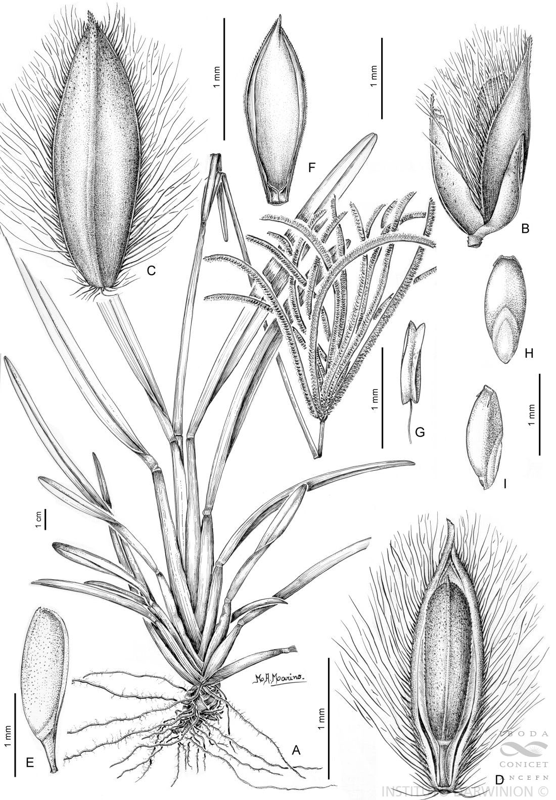 A, planta; B, espiguilla; C, antecio inferior fértil, vista dorsal; D, antecio superior estéril, vista dorsal y antecio inferior fértil, vista ventral; E, antecio superior estéril, vista lateral; F, pálea y lodículas; G, estambre; H, cariopsis, vista dorsal; I, cariopsis, vista lateral.