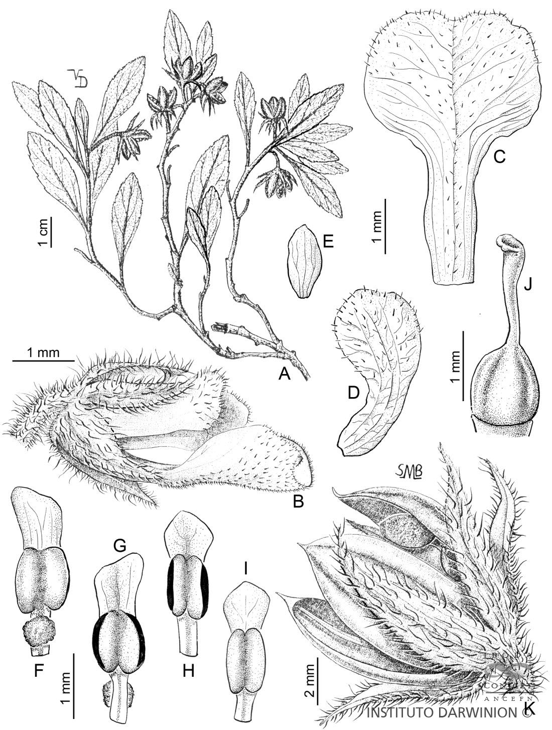 Hierbas ca. 10 cm de alto, simples o con pocas ramas. Hojas simples, alternas, a veces las superiores subopuestas; láminas lanceoladas a elípticas, de 10-40 × 4-15 mm, base aguda, ápice agudo u obtuso, márgenes dentados o subenteros, tomentosas en ambas superficies; pecíolos de 3-15 mm de largo, hirsutos; estípulas dobles, laterales, lineares, de 1,5-4 mm de largo, escariosas. Flores solitarias, blancas con la garganta amarilla; pedúnculos de 10-15 mm de largo, hirsutos; bractéolas subopuestas, ca. 2 mm de largo, de ápice barbado, escariosas; sépalos lanceolados, ca. 10 mm de largo, largamente agudos, 3-nervios, hirsutos; pétalos superiores lineares a elípticos, ca. 3 × 1 mm, glabros; pétalos laterales unguiculados, ca. 7 × 2 mm; pétalo inferior obcordado, ca. 10 mm de largo, superficie inferior pubescente; estambres ventrales con apéndices nectaríferos gibosos; ovario glabro. Cápsulas globoso-ovoides, glabras, valvas naviculares, ca. 10 × 2 mm. Semillas elípticas, ca. 2 mm de diámetro, amarillas.
