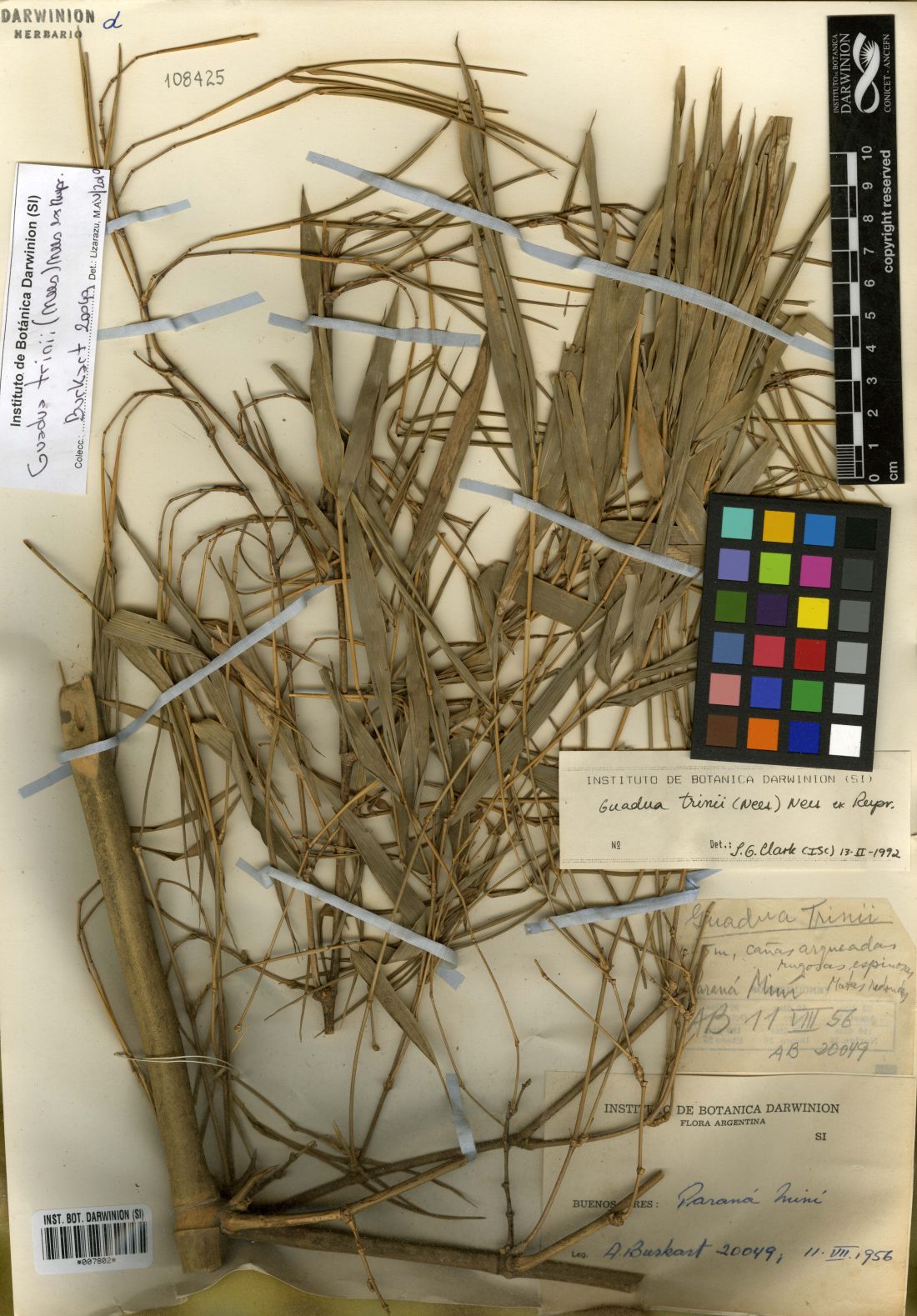 Plantas de 8-10 m de alto; rizomas definidos, paquimorfos; cañas de 3-5 cm de diámetro, huecas, con paredes de 5-7 mm de espesor; entrenudos rugoso-ásperos, surcados, nudos con espinas rígidas y curvadas; nudos con ramificaciones intravaginales y extravaginales, fasciculadas, las inferiores mayores de 1 m de largo, las superiores menores; hojas del culmo con vainas de 15-19 x 12-18 cm, 1,1-2 veces más largas que las láminas, fimbriadas, subglabras o glabras tanto en la vaina como en la lámina, sin aurículas o muy raramente presentes; lígula interna de 1 mm de largo, casi recta, con cilias hasta de 0,3 mm de largo; lígula externa ausente, en su lugar rara vez pilosidad que acompaña la línea de inserción de la lámina con la vaina; laminas de 6-18 x 8-12 cm, erectas, triangulares, pilosas en la cara adaxial y glabras en la abaxial; hojas del follaje con vainas pubescentes, estriadas, glabras en ambas caras, a veces pubescentes hacia el ápice de la cara adaxial, 7-10-nervias, fimbrias de 1,7-4 mm de largo, de mayor longitud que el pseudopecíolo; lígula interna reducida a un margen, ligula externa hasta de 0,4 mm de largo, reducida a un margen membranáceo; láminas de 4,5-10(-15) x 0,4-1,3(-2) cm, lanceoladas, ápice acuminado, caducas, pubescentes hacia la base, no teseladas, costilla central céntrica o excepcionalmente excéntrica; pseudopecíolo de 1-2 mm de largo, piloso en ambas caras. Sinflorescencia paniculada, de 1 m o más de largo, ramificada, foliosa. Pseudoespiguillas de 2,5-3 cm x 6-7 mm, 5-8-floras, linear-lanceoladas, múticas, lustrosas, pajizas, a veces con tintes violáceos, glabras; glumas y glumelas aovadas, ápice agudo; gluma superior coriácea, 11-17-nervias, ápice agudo; lemma de 9-12 x 5-7 mm, 16-nervia, teselada, mucrón apical de 0,5-1 mm de largo; pálea de 9-11 mm de largo, biaquillada, quillas aladas, alas de 0,5 mm de ancho, sobresalientes del antecio; lodiculas 3, aovadas, hialinas, 5-7-nervias, ápice pestañoso; anteras 6, de 5-7 mm de largo, apiculadas; ovario ovado-oblongo, pubescente hacia el ápice; estilos 3, libres o apenas connados, base del estilo piloso; estigmas plumosos; cariopsis aovada.