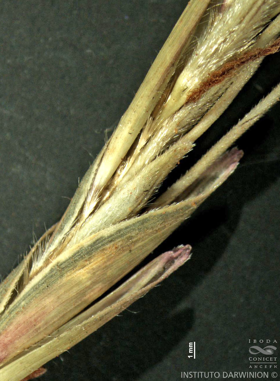 Plantas perennes, cespitosas, rizomatosas, con cañas erguidas, de 40-60 cm de alto, simples o ramificadas en la porción media y superior; entrenudos 5-8; nudos glabros a pilosos; vainas glabras a pilosas, usualmente menores que los entrenudos; lígulas membranáceas, ca. 1,5 mm de largo, ciliolada en el ápice; láminas lineares, de 6-15 x 0,1-0,3 cm, planas a revolutas, las superiores reducidas, glabras a densamente pilosas en ambas caras, de ápice agudo. Inflorescencia terminal, formada por un racimo solitario, de 2,5-5 cm de largo (excluida las aristas); pedúnculo exerto, cilíndrico, glabro; raquis de la ramificación desnudo en la base, glabro. Espiguillas sésiles superiores pistiladas, fusiformes, oblicuamente articuladas, con callo piloso; gluma inferior tan larga como la espiguilla, tubulosa, con el dorso longitudinalmente surcado, pubescente; gluma superior glumiforme, glabra a pilosa, con los bordes involutos, 1-nervia; lemma inferior ovada, menor que las glumas, hialina, enervia, cortamente ciliada en el ápice; lemma superior reducida a una arista robusta, de 4-6 mm de largo, retorcida en la base, geniculada, pubescente; pálea inferior menor que la lemma, hialina, ciliolada; estambres 3, anteras de 1-1,4 mm de largo; espiguillas pediceladas superiores similares a las espiguillas sésiles, sin arista, de 8-10 mm de largo; gluma inferior linear-lanceolada, rígida, glabra a esparcidamente pilosa en la porción superior del dorso, bicarenada, 9-nervia; gluma superior linear, tan larga como la superior o ligeramente menor, papirácea, con los márgenes pestañosos, 3-nervia; espiguillas pediceladas o sésiles basales similares a las espiguillas pediceladas superiores; cariopsis largamente elipsoide.