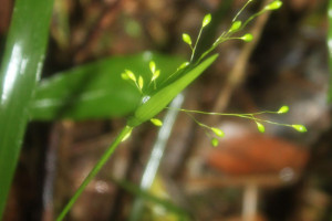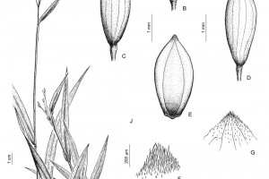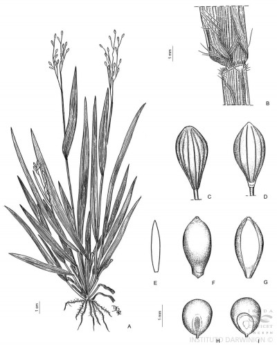 Plantas perennes, estoloníferas, de 0,15-0,40 m de alto; cañas geniculadas, ramificadas en los nudos inferiores; entrenudos cilíndricos, glabros, huecos; nudos glabros, oscuros; vainas de 2-8 cm de largo, con los márgenes papiloso-pilosos a glabros; lígulas membranáceas, de 0,4-0,8 mm de largo; cuello oscuro, piloso o glabro; láminas lanceoladas, de 4-12 cm x 6-9 mm, planas, acuminadas, de base angostada, pilosas, los márgenes escabriúsculos. Inflorescencias laxas, difusas, de 5-11 cm de largo; eje principal escabroso, pulvínulos finamente pubescentes; ramificaciones de primer orden alternas a opuestas, divergentes del eje principal, pedicelos de 3-18 mm de largo, escabrosos. Espiguillas elipsoides a obovoides, de 3,2-3,7 x 1,2-1,5 mm, glabras, verdosas a oliváceas, viscosas a la madurez; gluma inferior de 3,1-3,5 mm de largo, aguda, 5-9 nervia, glabra; gluma superior de 2,9-3,4 mm de largo, aguda 7-9 nervia, glabra; lemma inferior glumiforme, de 2,8-3,3 mm de largo, 5-7 nervia, cubierta de micropelos bi o tricelulares, obovoides; pálea inferior ovado-lanceolada, de 1,9-2,4 x 0,4-0,7 mm, membranácea, glabra; flor inferior ausente; antecio superior elipsoide, de 2,8-3,2 x 1,1-1,3 mm, liso, lustroso, endurecido; cariopsis obovoide, de 1,8-2 x 1,4-1,8 mm; hilo linear, ½ del largo de la cariopsis, embrión ½ del largo de la cariopsis.
