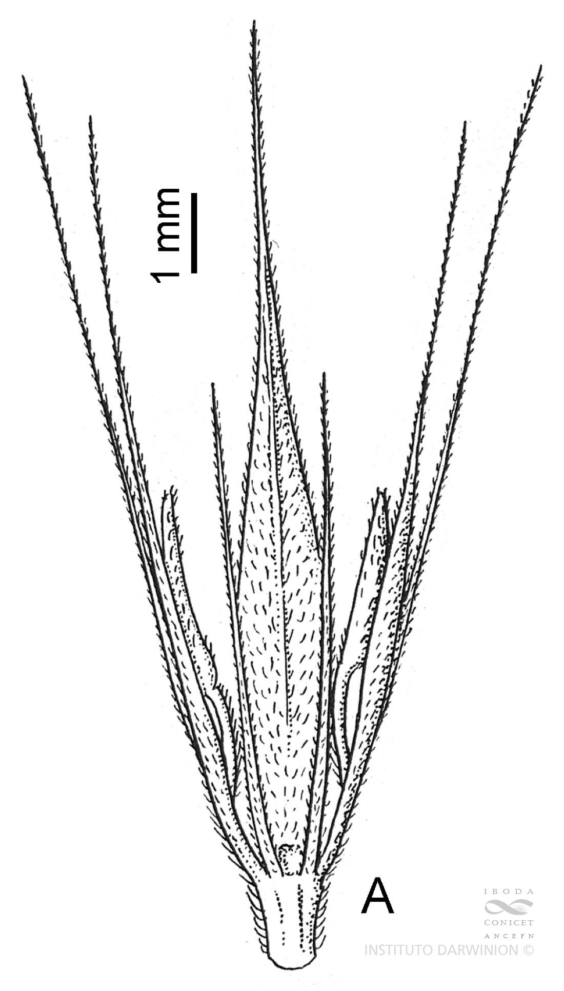 Plantas perennes, por lo general densamente cespitosas, con cañas de (28-)35-120(-150) cm de alto, erectas, rígidas, pluricaules; nudos glabros; lígulas de (0,5)0,8-2(-3) mm de largo, truncadas; láminas de 25-180(-200) x 1,4-7,1 mm, planas, glabras a densamente pilosas; aurículas ausentes. Inflorescencia una espiga de(45-)65-110(-130) x (3-) 4-5 mm, pajizo verdosa; raquis frágil. Espiguilla central sésil; glumas de 4-11 x 0,2-0,5 mm, aplanadas en la base, lanceoladas, escabrosas, erectas; cuerpo de la lemma de 5-9 mm de largo esparcida a densamente pubescente, raro glabro, con 5 nervios poco conspicuos, el ápice aristulado a aristado, arista de (2-)2,5-7(-9) mm de largo; pálea de 6-9 mm de largo, pubescente; lodículas de 1 mm de largo, agudas; anteras de (1,5)2,2-4,4(-5) mm de largo, amarillas; prolongación de la raquilla usualmente ausente, cuando presente hasta de 5,5 mm de largo. Espiguillas laterales rudimentarias, estériles, pedicelos de 1,7-3,2(-3,7) mm de largo; gluma inferior de (4,5-)5-12(-14) x 0,2-0,3 mm, aplanada en la base; gluma superior de (4-)5-12(-14) x 0,2-0,3 mm, setácea a algo aplanada.