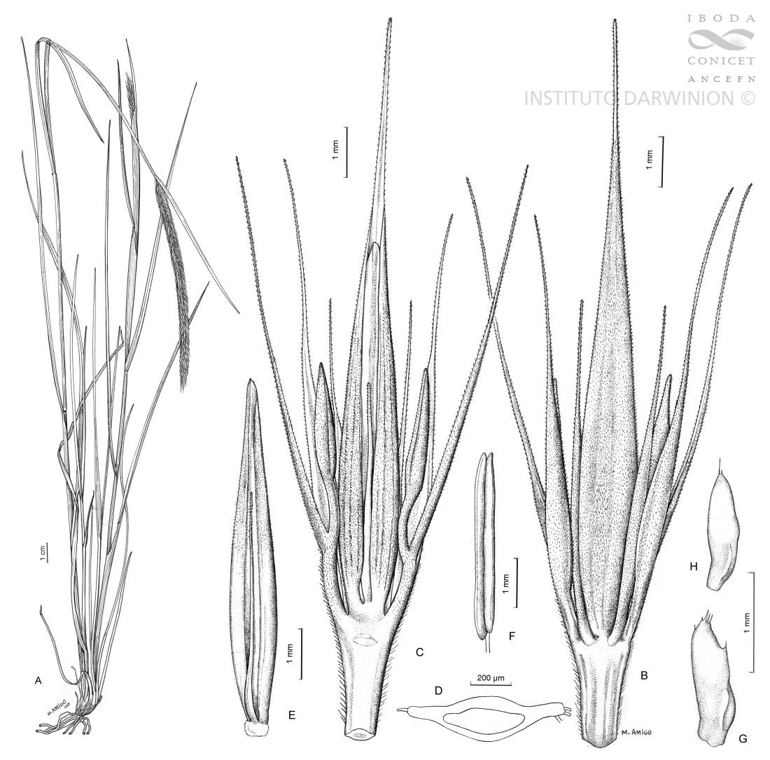 Plantas perennes, por lo general densamente cespitosas, con cañas de (28-)35-120(-150) cm de alto, erectas, rígidas, pluricaules; nudos glabros; lígulas de (0,5)0,8-2(-3) mm de largo, truncadas; láminas de 25-180(-200) x 1,4-7,1 mm, planas, glabras a densamente pilosas; aurículas ausentes. Inflorescencia una espiga de(45-)65-110(-130) x (3-) 4-5 mm, pajizo verdosa; raquis frágil. Espiguilla central sésil; glumas de 4-11 x 0,2-0,5 mm, aplanadas en la base, lanceoladas, escabrosas, erectas; cuerpo de la lemma de 5-9 mm de largo esparcida a densamente pubescente, raro glabro, con 5 nervios poco conspicuos, el ápice aristulado a aristado, arista de (2-)2,5-7(-9) mm de largo; pálea de 6-9 mm de largo, pubescente; lodículas de 1 mm de largo, agudas; anteras de (1,5)2,2-4,4(-5) mm de largo, amarillas; prolongación de la raquilla usualmente ausente, cuando presente hasta de 5,5 mm de largo. Espiguillas laterales rudimentarias, estériles, pedicelos de 1,7-3,2(-3,7) mm de largo; gluma inferior de (4,5-)5-12(-14) x 0,2-0,3 mm, aplanada en la base; gluma superior de (4-)5-12(-14) x 0,2-0,3 mm, setácea a algo aplanada.