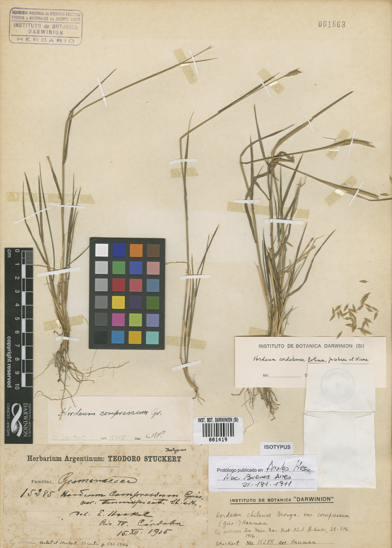 Hordeum chilense Brongn. var. compressum (Griseb.) Hauman var. compressum (Griseb.) Hauman Anales Mus. Nac. Hist. Nat. Buenos Aires 28: 276. 1916