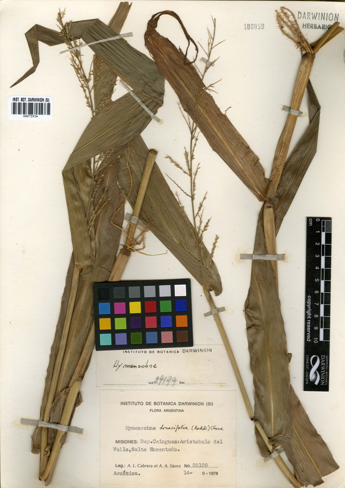 Plantas perennes, rizomatosas, con cañas multinodes, rastreras, luego erguidas, arraigadas en los nudos inferiores; cañas floríferas hasta de 2 m de alto; entrenudos de 8-20 x 0,5-1 cm, glabros, estriados, macizos; nudos glabros, castaños; vainas de 8-12 cm de largo, usualmente más cortas que los entrenudos, glabras, estriadas, verdosas, los márgenes membranáceos, glabros a pestañosos junto al ápice; lígulas de 0,3-0,9 mm de largo, de base membranácea y ápice cortamente ciliado; láminas lanceoladas, de 13-33 x 1,5-4,5 cm, planas, con vénulas transversales, glabras, de base cordada, amplexicaule y ápice atenuado, los bordes cartilaginosos, lisos a escabrosos, pestañosos hacia la base. Inflorescencias de 18-40 x 3-8 cm, piramidales, laxas, exertas; pedúnculos hasta de 10 cm de largo, teretes, glabros, finamente estriados; eje principal anguloso, escabriúsculo; ramificaciones de primer orden de 5-12 cm de largo, reducidas hacia el ápice, divergentes, ascendentes, dorsiplanas, escabriúsculas; ramificaciones de segundo orden adpresas, escabriúsculas; pulvínulos cortamente pilosos; espiguillas dispuestas unilateralmente, solitarias, en pares o fasciculadas (3-6); pedicelos breves, teretes, escabriúsculos. Espiguillas largamente elipsoides, de 2,4-3 x 0,6 mm, de ápice cortamente acuminado, glabras a esparcidamente pilosas hacia el ápice; gluma superior y lemma inferior subiguales o la gluma superior algo menor que la lemma inferior; gluma inferior aovada, de 0,9-1,5 mm de largo, ? o un poco menos de ½ del largo de la espiguilla, de ápice agudo, glabra, escabriúscula sobre el nervio medio, abrazadora, 1-3 nervia; gluma superior lanceolada, de 2,1-2,5 mm de largo, de ápice agudo, escabriúscula sobre los nervios en la porción superior, 5-nervia; gluma inferior y superior separadas por un breve entrenudo ca. 0,3 mm de largo; lemma inferior glumiforme, de 2,4-2,7 mm de largo, 5-nervia; pálea inferior ausente; antecio superior largamente elipsoide, de 2-2,5 x 0,6 mm, membranáceo, liso, glabro, escabriúsculo hacia el ápice, abierto en su extremidad superior; lemma superior con los bordes planos, hialinos sobre la pálea; pálea superior 2-nervia; lodículas 2, pequeñas, ca. 0,2 mm de largo; estambres 3, anteras de 0,3-0,5 mm de largo; estilos 2, libres desde la base; cariopsis ovoide, de 1 x 0,5 mm, pajiza; hilo oblongo, embrión ½ o un poco menos del largo de la cariopsis.