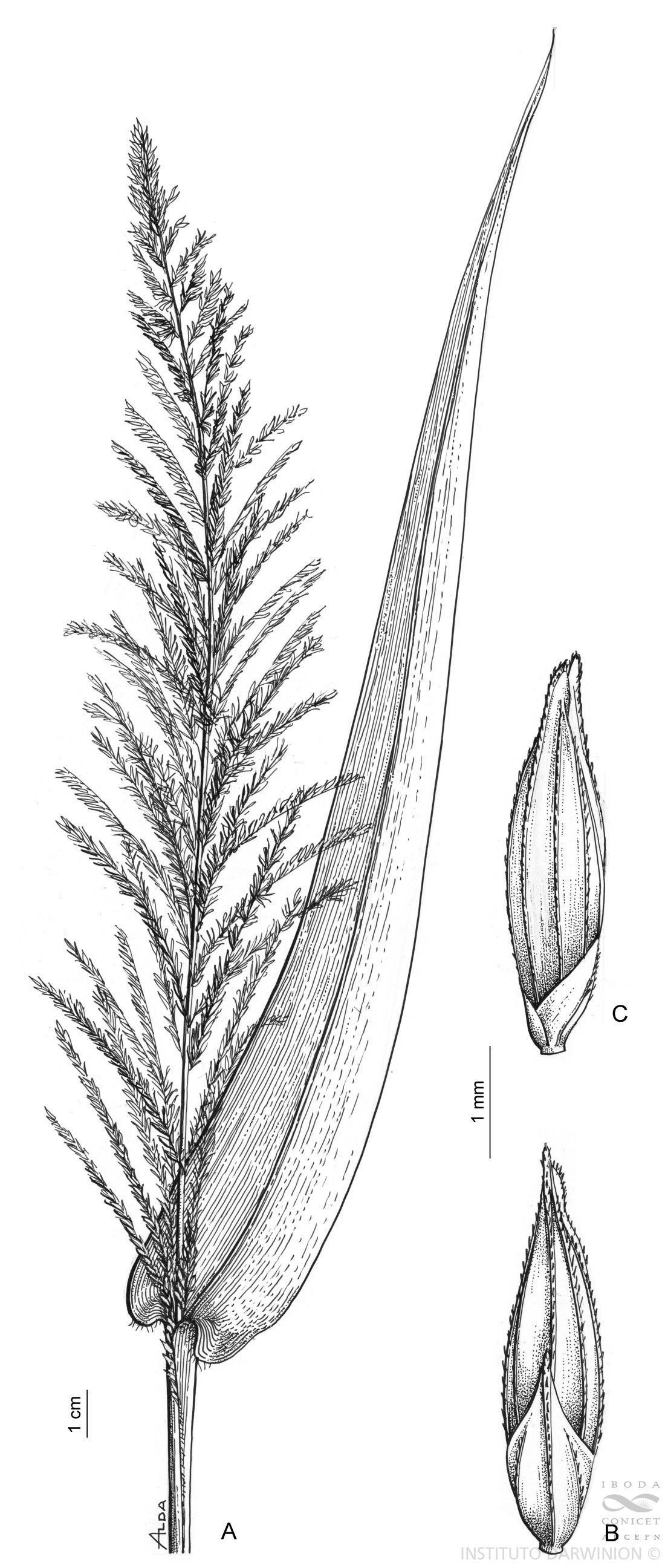 Plantas perennes, rizomatosas, con cañas multinodes, rastreras, luego erguidas, arraigadas en los nudos inferiores; cañas floríferas hasta de 2 m de alto; entrenudos de 8-20 x 0,5-1 cm, glabros, estriados, macizos; nudos glabros, castaños; vainas de 8-12 cm de largo, usualmente más cortas que los entrenudos, glabras, estriadas, verdosas, los márgenes membranáceos, glabros a pestañosos junto al ápice; lígulas de 0,3-0,9 mm de largo, de base membranácea y ápice cortamente ciliado; láminas lanceoladas, de 13-33 x 1,5-4,5 cm, planas, con vénulas transversales, glabras, de base cordada, amplexicaule y ápice atenuado, los bordes cartilaginosos, lisos a escabrosos, pestañosos hacia la base. Inflorescencias de 18-40 x 3-8 cm, piramidales, laxas, exertas; pedúnculos hasta de 10 cm de largo, teretes, glabros, finamente estriados; eje principal anguloso, escabriúsculo; ramificaciones de primer orden de 5-12 cm de largo, reducidas hacia el ápice, divergentes, ascendentes, dorsiplanas, escabriúsculas; ramificaciones de segundo orden adpresas, escabriúsculas; pulvínulos cortamente pilosos; espiguillas dispuestas unilateralmente, solitarias, en pares o fasciculadas (3-6); pedicelos breves, teretes, escabriúsculos. Espiguillas largamente elipsoides, de 2,4-3 x 0,6 mm, de ápice cortamente acuminado, glabras a esparcidamente pilosas hacia el ápice; gluma superior y lemma inferior subiguales o la gluma superior algo menor que la lemma inferior; gluma inferior aovada, de 0,9-1,5 mm de largo, ? o un poco menos de ½ del largo de la espiguilla, de ápice agudo, glabra, escabriúscula sobre el nervio medio, abrazadora, 1-3 nervia; gluma superior lanceolada, de 2,1-2,5 mm de largo, de ápice agudo, escabriúscula sobre los nervios en la porción superior, 5-nervia; gluma inferior y superior separadas por un breve entrenudo ca. 0,3 mm de largo; lemma inferior glumiforme, de 2,4-2,7 mm de largo, 5-nervia; pálea inferior ausente; antecio superior largamente elipsoide, de 2-2,5 x 0,6 mm, membranáceo, liso, glabro, escabriúsculo hacia el ápice, abierto en su extremidad superior; lemma superior con los bordes planos, hialinos sobre la pálea; pálea superior 2-nervia; lodículas 2, pequeñas, ca. 0,2 mm de largo; estambres 3, anteras de 0,3-0,5 mm de largo; estilos 2, libres desde la base; cariopsis ovoide, de 1 x 0,5 mm, pajiza; hilo oblongo, embrión ½ o un poco menos del largo de la cariopsis.