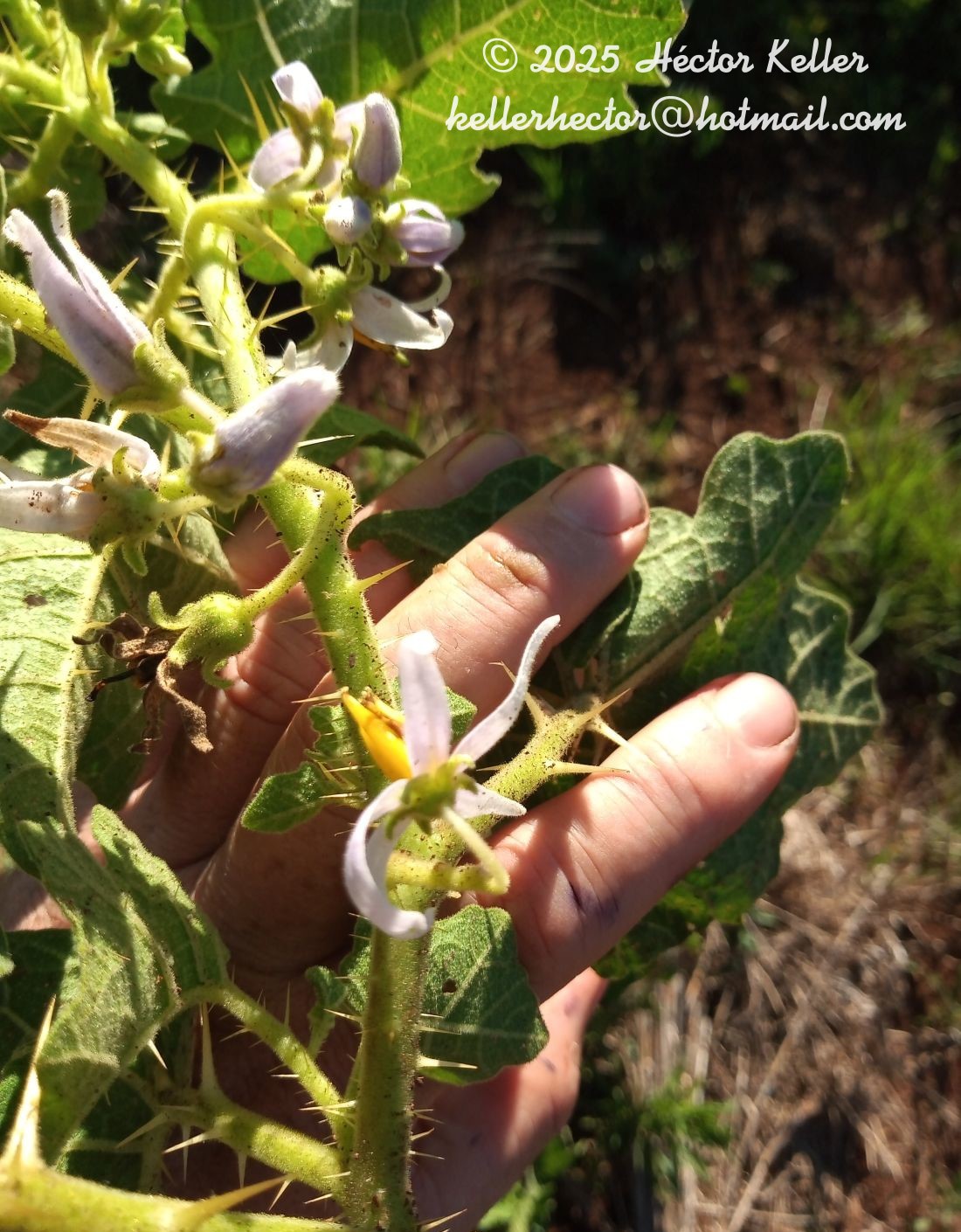 Hierbas perennes o arbustos, andromonoicos, hasta de 60 cm de alto; tallos con acúleos aciculares y con tricomas estrellados sésiles o subsésiles, tricomas multiangulados, tricomas glandulares y otros estrellado-glandulares. Pecíolos hasta de 5 cm, con acúleos subaciculares; láminas de contorno orbicular suborbicular, base cordada, ápice agudo, oscuramente lobadas, lóbulos irregulares y éstos a la vez lobados; epifilo con tricomas estrellados sésiles, tricomas multiangulados y estrellado-glandulares; hipofilo con acúleos aciculares y con igual tipo de tricomas que el epifilo pero más densos. Inflorescencia pedunculada, no ramificada, con unas (0-)1(-3) flores perfectas y 1-2 estaminadas. Cáliz pubescente, lóbulos triangulares o angostamente triangulares, cubiertos de tricomas estrellado-glandulares; corola estrellada, blanca, ca. 3 mm de diámetro; anteras amarillas, iguales, de 10 mm; estilo de las flores perfectas ca. 12 mm. Baya globosa, ca. 2,75 cm de diámetro, amarilla, pericarpo esponjoso; semillas ca. 180 por fruto, lenticulares, de 3,5-5 mm, lisas, castañas.