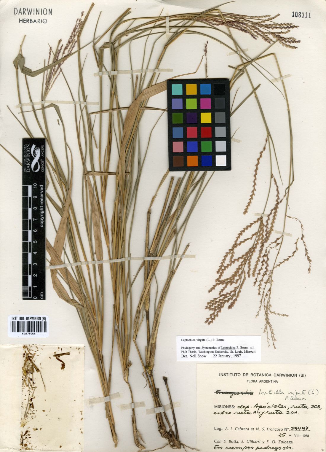 Observaciones: Snow (1998) reevaluó los taxones considerados dentro del complejo de Leptochloa virgata (tal como fueron reconocidos por Nicora, 1995: L. procera; L. barbata; L. virgata var. virgata y var. puberula), concluyendo, luego de examinar más de 1600 ejemplares del Neotrópico, que los caracteres diagnósticos para distinguir estos taxones (entre los que se consideraron el largo de las aristas, pilosidad del callo y del cuello y presencia de pelos en el dorso de la lemma, entre otros) no eran consistentes. Así, se reconoce a L. virgata como una especie altamente polimórfica y con una amplia distribución geográfica.