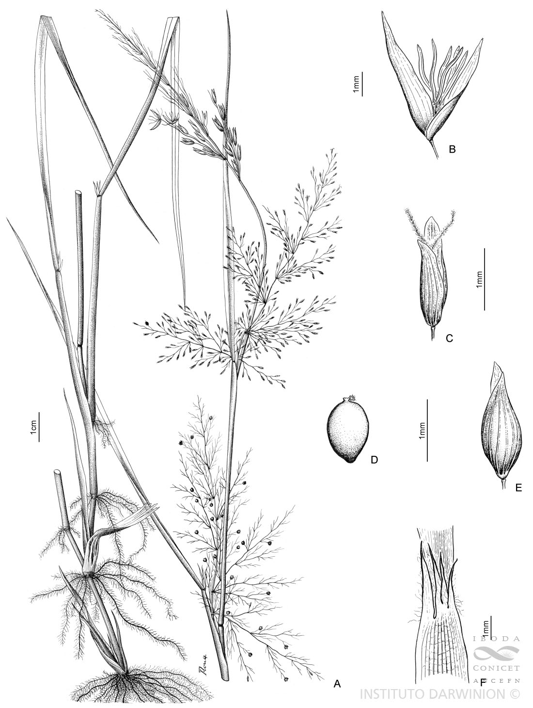 Hierbas bajas, glabras, rizomatosas, rizomas largos, delgados; cañas simples o ramificadas, de 6-30 cm de altura, radicantes en los nudos; vainas glabras; lígula membranácea, erecta, de 4-7,5 mm de largo, normalmente laciniada, aguda, decurrente en la vaina; láminas tiernas, planas, de 4-17 cm x 2-3 mm, ápice agudo. Inflorescencia masculina apical, pauciflora, de 3-8 cm de largo. Espiguillas elíptico-oblongas, de 6-7,5 mm de largo, hialinas, en general con 8-9 estambres, sostenidas por pedicelos largos, filiformes. Inflorescencia femenina axilar, de 2-7 cm largo, el pedúnculo normalmente incluido en la vaina foliar correspondiente. Espiguillas violáceas de 2-2,5 mm de largo, glumelas 7-nervias, nervios conspicuos; aquenio ovoide, liso o papiloso, de 1,2-1,5 mm de largo, incluido en las glumelas y menor que éstas, castaño-oscuro a la madurez, el pericarpio separado de la semilla, ésta blanca, harinosa; base de los estilos persistentes sobre el fruto.