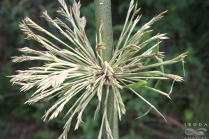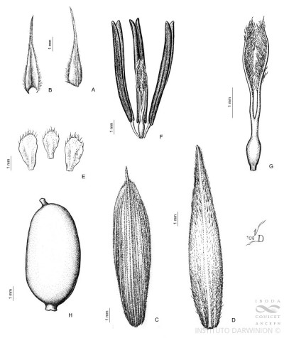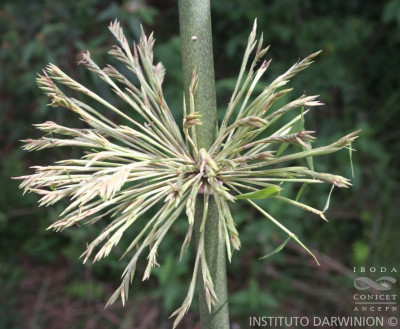 Plantas perennes, cespitosas; rizomas paquimorfos; cañas de 4-10 m de altura, 0,7-5 cm de diámetro, erectas o péndulas, fistulosas, escabrosas, subglabas; nudos pubescentes en la parte inferior, pelos blanquecinos; entrenudos cilíndricos, huecos; ramificaciones complementarias de 26-34 cm de largo, con 16-42 ramas por nudo, flabeliformes; hojas de las cañas con vainas brillantes y glabras en la cara ventral, en la cara dorsal opacas, lanosas, surcadas; láminas lanceoladas, caedizas; entrenudos de las ramificaciones de 1,5-3 mm de diámetro, surcados longitudinalmente, suglabros, pubescentes por encima y debajo de los nudos; nudos de las ramas vegetativas y reproductivas protuberantes, pajizos o pardos; hojas de las ramificaciones con vainas glabras en la cara ventral, levemente escabrosas en la cara dorsal, surcadas longitudinalmente, márgenes fimbriados; setas orales de (4-)6-12 mm de largo, caedizas, circinadas, blanquecinas, lisas; lígulas ventrales truncadas, membranáceas, lígulas dorsales reducidas a una línea de cilios; pseudopecíolos de (1-)2-5 x 1-1,5 mm, pajizos, raramente oscuros, subglabros o escasamente pilosos; pulvínulo presente en la articulación entre la lámina y el pseudopecíolo, rara vez ausente; láminas (6-)8-13 x 1,2-2,8 cm, anchamente lanceoladas, abruptamente atenuadas, algo asimétricas, base obtusa, (8-)14-16-nervias, glabras, pilosas en la base de la cara dorsal e híspidas en la cara ventral, márgenes escabrosos; ramas floríferas de 26-43 cm de largo. Racimos (5,5-)7-11 x 1,4-1,8 cm, rectos, ocasionalmente subfalcados, pectinados, con 18-29 espiguillas; raquis piloso, pelos blancuzcos; pedícelos de 2-3 mm de largo, pilosos, pelos blanquecinos: Espiguillas (10-)13-21 x 3-6,5 mm, subsésiles, subpatentes, 1(-2) floras; gluma inferior de 2-6 x 0,75-1,5 mm, 1-nervia, ovada, ápice acuminado o cuspidado, pubescente, gluma superior de 9-14 x 3-5 mm, (8-)10-13-nervia, ovada, mucronada, con tintes marrones en la cara ventral, pubescente en la región distal, el resto glabro; lemma fértil de (8-)11-15 mm de largo, 14-18 nervia, lanceolada, aguda, coriácea, con tintes negros, pilosa, a veces subglabra, pelos blanquecinos; pálea fértil de 10-15 mm de largo, 8-10-nervia, biaquillada, elipsoide, subglabra o glabra, pelos blanquecinos; raquilla de 7,5-13 mm de largo, excurrente, con un antecio rudimentario en la parte distal, pilosa; lodículas 3, 3-nervias, cuneiformes, membranáceas, desiguales, margen ciliado; lodículas anteriores de 3-3,2 x 1,4-1,5 mm, la posterior de 1,8-2 x ca. 1 mm; estambres 3; anteras 3 de (6,5-)9-11 mm de largo, ápice bífido; ovario de 1-2,5 mm de largo; estigmas 2, (1-)3-6 mm de largo, compuestos por pelos densos, cortos y largos; estilopodio de 1-2 mm de largo, cilíndrico; aquenio 6-7 x 3-4 mm, ovoide con el contorno oblongo, rostrado, pajizo.