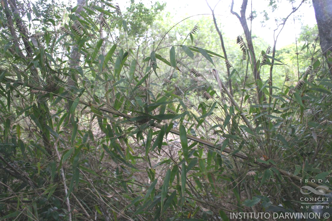 Plantas perennes, cespitosas; rizomas paquimorfos; cañas de 4-10 m de altura, 0,7-5 cm de diámetro, erectas o péndulas, fistulosas, escabrosas, subglabas; nudos pubescentes en la parte inferior, pelos blanquecinos; entrenudos cilíndricos, huecos; ramificaciones complementarias de 26-34 cm de largo, con 16-42 ramas por nudo, flabeliformes; hojas de las cañas con vainas brillantes y glabras en la cara ventral, en la cara dorsal opacas, lanosas, surcadas; láminas lanceoladas, caedizas; entrenudos de las ramificaciones de 1,5-3 mm de diámetro, surcados longitudinalmente, suglabros, pubescentes por encima y debajo de los nudos; nudos de las ramas vegetativas y reproductivas protuberantes, pajizos o pardos; hojas de las ramificaciones con vainas glabras en la cara ventral, levemente escabrosas en la cara dorsal, surcadas longitudinalmente, márgenes fimbriados; setas orales de (4-)6-12 mm de largo, caedizas, circinadas, blanquecinas, lisas; lígulas ventrales truncadas, membranáceas, lígulas dorsales reducidas a una línea de cilios; pseudopecíolos de (1-)2-5 x 1-1,5 mm, pajizos, raramente oscuros, subglabros o escasamente pilosos; pulvínulo presente en la articulación entre la lámina y el pseudopecíolo, rara vez ausente; láminas (6-)8-13 x 1,2-2,8 cm, anchamente lanceoladas, abruptamente atenuadas, algo asimétricas, base obtusa, (8-)14-16-nervias, glabras, pilosas en la base de la cara dorsal e híspidas en la cara ventral, márgenes escabrosos; ramas floríferas de 26-43 cm de largo. Racimos (5,5-)7-11 x 1,4-1,8 cm, rectos, ocasionalmente subfalcados, pectinados, con 18-29 espiguillas; raquis piloso, pelos blancuzcos; pedícelos de 2-3 mm de largo, pilosos, pelos blanquecinos: Espiguillas (10-)13-21 x 3-6,5 mm, subsésiles, subpatentes, 1(-2) floras; gluma inferior de 2-6 x 0,75-1,5 mm, 1-nervia, ovada, ápice acuminado o cuspidado, pubescente, gluma superior de 9-14 x 3-5 mm, (8-)10-13-nervia, ovada, mucronada, con tintes marrones en la cara ventral, pubescente en la región distal, el resto glabro; lemma fértil de (8-)11-15 mm de largo, 14-18 nervia, lanceolada, aguda, coriácea, con tintes negros, pilosa, a veces subglabra, pelos blanquecinos; pálea fértil de 10-15 mm de largo, 8-10-nervia, biaquillada, elipsoide, subglabra o glabra, pelos blanquecinos; raquilla de 7,5-13 mm de largo, excurrente, con un antecio rudimentario en la parte distal, pilosa; lodículas 3, 3-nervias, cuneiformes, membranáceas, desiguales, margen ciliado; lodículas anteriores de 3-3,2 x 1,4-1,5 mm, la posterior de 1,8-2 x ca. 1 mm; estambres 3; anteras 3 de (6,5-)9-11 mm de largo, ápice bífido; ovario de 1-2,5 mm de largo; estigmas 2, (1-)3-6 mm de largo, compuestos por pelos densos, cortos y largos; estilopodio de 1-2 mm de largo, cilíndrico; aquenio 6-7 x 3-4 mm, ovoide con el contorno oblongo, rostrado, pajizo.
