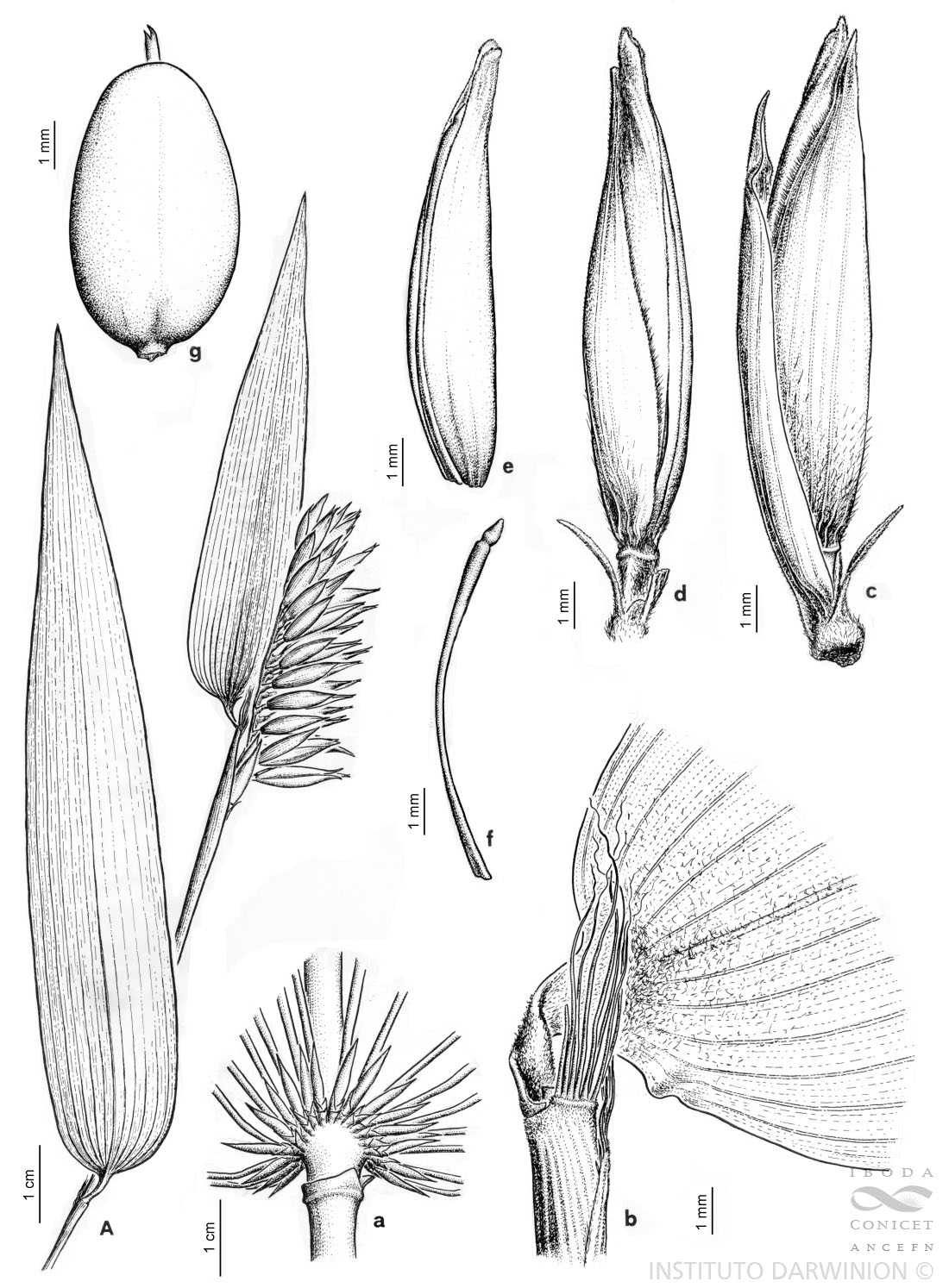 Plantas perennes, cespitosas; rizomas paquimorfos; cañas de 4-10 m de altura, 0,7-5 cm de diámetro, erectas o péndulas, fistulosas, escabrosas, subglabas; nudos pubescentes en la parte inferior, pelos blanquecinos; entrenudos cilíndricos, huecos; ramificaciones complementarias de 26-34 cm de largo, con 16-42 ramas por nudo, flabeliformes; hojas de las cañas con vainas brillantes y glabras en la cara ventral, en la cara dorsal opacas, lanosas, surcadas; láminas lanceoladas, caedizas; entrenudos de las ramificaciones de 1,5-3 mm de diámetro, surcados longitudinalmente, suglabros, pubescentes por encima y debajo de los nudos; nudos de las ramas vegetativas y reproductivas protuberantes, pajizos o pardos; hojas de las ramificaciones con vainas glabras en la cara ventral, levemente escabrosas en la cara dorsal, surcadas longitudinalmente, márgenes fimbriados; setas orales de (4-)6-12 mm de largo, caedizas, circinadas, blanquecinas, lisas; lígulas ventrales truncadas, membranáceas, lígulas dorsales reducidas a una línea de cilios; pseudopecíolos de (1-)2-5 x 1-1,5 mm, pajizos, raramente oscuros, subglabros o escasamente pilosos; pulvínulo presente en la articulación entre la lámina y el pseudopecíolo, rara vez ausente; láminas (6-)8-13 x 1,2-2,8 cm, anchamente lanceoladas, abruptamente atenuadas, algo asimétricas, base obtusa, (8-)14-16-nervias, glabras, pilosas en la base de la cara dorsal e híspidas en la cara ventral, márgenes escabrosos; ramas floríferas de 26-43 cm de largo. Racimos (5,5-)7-11 x 1,4-1,8 cm, rectos, ocasionalmente subfalcados, pectinados, con 18-29 espiguillas; raquis piloso, pelos blancuzcos; pedícelos de 2-3 mm de largo, pilosos, pelos blanquecinos: Espiguillas (10-)13-21 x 3-6,5 mm, subsésiles, subpatentes, 1(-2) floras; gluma inferior de 2-6 x 0,75-1,5 mm, 1-nervia, ovada, ápice acuminado o cuspidado, pubescente, gluma superior de 9-14 x 3-5 mm, (8-)10-13-nervia, ovada, mucronada, con tintes marrones en la cara ventral, pubescente en la región distal, el resto glabro; lemma fértil de (8-)11-15 mm de largo, 14-18 nervia, lanceolada, aguda, coriácea, con tintes negros, pilosa, a veces subglabra, pelos blanquecinos; pálea fértil de 10-15 mm de largo, 8-10-nervia, biaquillada, elipsoide, subglabra o glabra, pelos blanquecinos; raquilla de 7,5-13 mm de largo, excurrente, con un antecio rudimentario en la parte distal, pilosa; lodículas 3, 3-nervias, cuneiformes, membranáceas, desiguales, margen ciliado; lodículas anteriores de 3-3,2 x 1,4-1,5 mm, la posterior de 1,8-2 x ca. 1 mm; estambres 3; anteras 3 de (6,5-)9-11 mm de largo, ápice bífido; ovario de 1-2,5 mm de largo; estigmas 2, (1-)3-6 mm de largo, compuestos por pelos densos, cortos y largos; estilopodio de 1-2 mm de largo, cilíndrico; aquenio 6-7 x 3-4 mm, ovoide con el contorno oblongo, rostrado, pajizo.