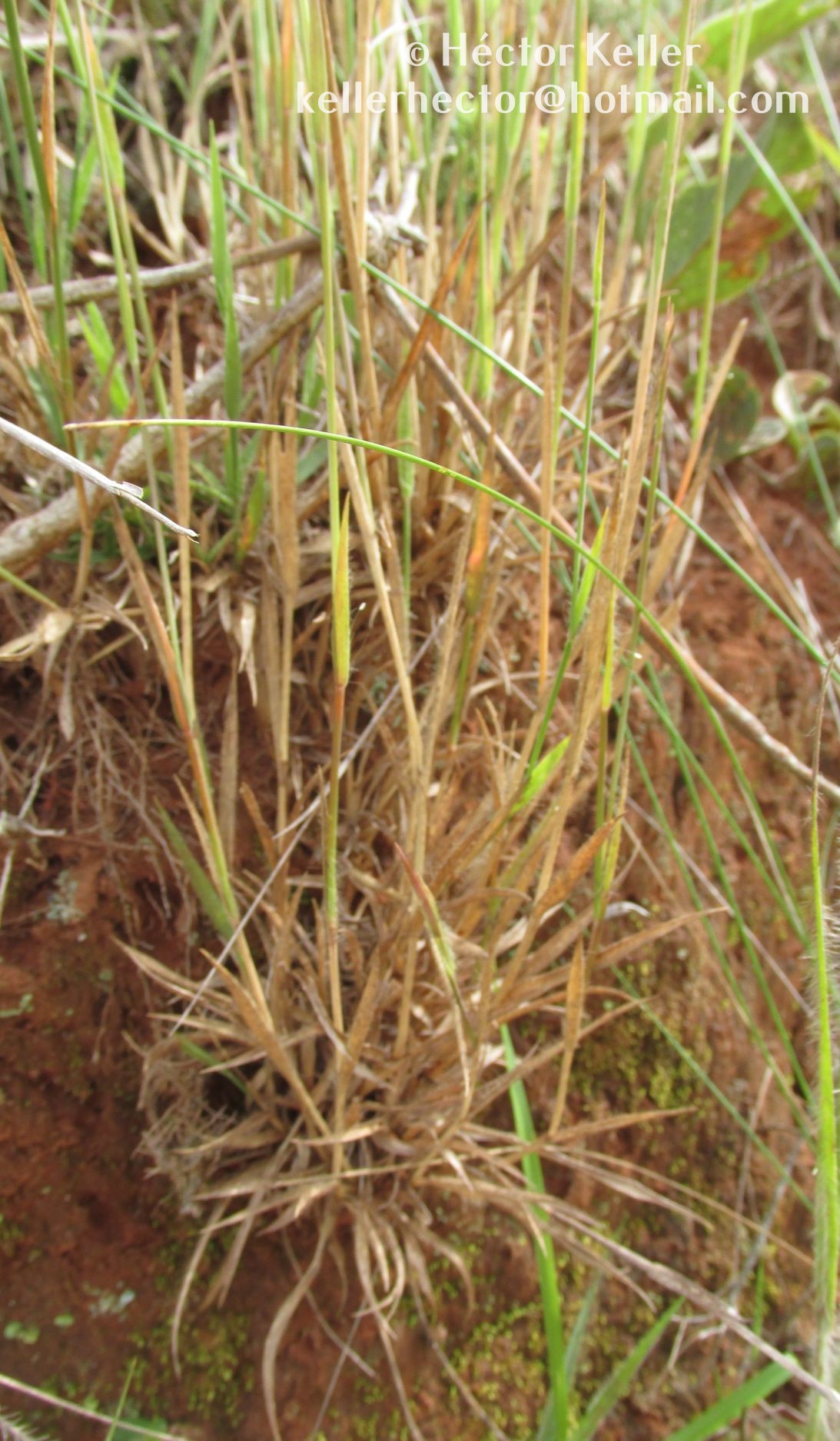 Plantas perennes, de 40-80 cm de alto, cortamente rizomatosas; cañas erectas, subrígidas; entrenudos 4-7, cilíndricos, pajizos, glabros; nudos basales cortamente pilosos, los superiores glabros, comprimidos; vainas usualmente mayores que los entrenudos, pubescentes a papiloso-hirsutas, con los márgenes pilosos; lígulas pestañosas, breve, ca. 0,5 mm de largo; cuello distinguible con una línea conspicua; láminas lineares, de 3-10 x 0,2-0,5 cm, planas o con los márgenes enrollados; glabrescentes a papiloso-hirsutas, de base atenuada y ápice largamente subulado, los márgenes papiloso-hirsutos. Inflorescencia un racimo solitario, linear, de 4-12 x 0,4 cm, erectas, platinadas, con pelos sedosos; raquis triquetro, sinuoso, glabro; pedicelos breves, ca. 0,3 mm de largo, cilíndricos, lisos; espiguillas solitarias, dispuestas en 2 series, imbricadas. Espiguillas elipsoides, de 3,5-4,6 x 1,2-1,4 mm, vilosas hacia la porción basal, con pelos sedosos, blanco-plateados a amarillos; gluma inferior y superior subiguales, más cortas que la espiguilla, gluma inferior ligeramente asimétrica, ¾ del largo de la espiguilla, dejando al descubierto la porción apical del antecio superior, densamente pilosa en hacia la base y en el tercio inferior a lo largo del nervio medio o hacia los márgenes, el resto de la superficie glabra, escabriúscula hacia el ápice, 3-nervia, en ocasiones el nervio medio parcialmente desarrollado; gluma superior glumiforme, con los bordes pectinados, con pelos de base tuberculada, 3-nervia; lemma inferior tan larga como la espiguilla, 5-nervia, con los márgenes pectinados, con pelos ca. 3 mm de largo, con un mechón de pelos próximos al ápice; pálea inferior y flor inferior ausentes; antecio superior elipsoide, de 3,2-3,6 x 0,8 mm, coriáceo, liso, finamente papiloso, de ápice agudo; lemma con los márgenes planos sobre la pálea; pálea de igual consistencia que su lemma; estambres 3, anteras ca. 1,6 mm de largo; estigmas rosados, de emergencia lateral; cariopsis no vista.