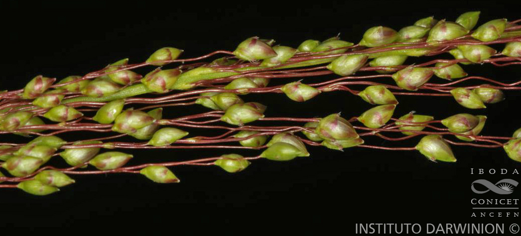 Planta perenne, rizomatosa, con rizomas manifiestos; cañas erectas, simples, de 0,40-1(-1,5) m de alto; entrenudos de 12-27 cm de largo, rígidos, teretes, huecos, glabros; nudos glabros o pilosos, en este caso con pelos blanquecinos adpresos; vainas de 6-28 cm de largo, usualmente más cortas que los entrenudos, glabras a hirsutas, con pelos papilosos, rígidos, lisas a ligeramente escabriúsculas, verdosas a púrpuras, las basales fasciculadas, aquilladas, los márgenes membranáceos, glabros a pestañosos; lígulas 0,6-1,5 mm de largo, membranáceas, de ápice cortamente ciliado, con largos pelos por detrás en la base de la lámina o sin los mismos; láminas lineares, de 6-54 x 0,4-1,5 cm, planas, glabras a esparcidamente pilosas, escabriúsculas, gradualmente atenuadas hacia la base y el ápice, los bordes glabros, escabriúsculos, los inferiores ocasionalmente ciliados. Inflorescencia terminal exerta, pedúnculo hasta de 30 cm de largo, terete, glabro, estriado, panoja laxa, piramidal, multiflora, de 7-28 x 5-15 cm; eje principal anguloso, surcado, glabro a esparcidamente piloso, finamente escabroso, pulvínulos glabros o con escasos pelos, castáneos a purpúreos; ramificaciones de primer orden de 2-9 cm de largo, divergentes, ascendentes, alternas, opuestas o verticiladas, eje de las ramificaciones flexuoso, liso, glabro o con pelos esparcidos, pajizo o con tintes purpúreos, ramificaciones de segundo orden poco divergentes; pedicelos desiguales, el superior 1-2,5 veces más largo que el basal, teretes, glabros, flexuosos, lisos, de ápice cupuliforme. Espiguillas ovoides, de 2,1-3,3 x 1,2-2,5 mm, glabras, glumas subiguales, más cortas que el largo de la espiguilla, membranáceas, pajizas o con tintes purpúreos; gluma inferior anchamente ovada, de 0,8-1,2 mm de largo, subaguda, glabra o pilosa en la porción superior, escabrosa sobre el nervio medio, no abrazadora, 1-3 nervia; gluma superior anchamente ovada, de 0,8-1,1 mm de largo, de ápice truncado y dorso convexo, 5-7 nervia; lemma inferior ovado-lanceolada, de 2,1-3,1 mm de largo, membranácea, navicular, cuando madura coriácea, 3-nervia; pálea inferior membranácea, de 2-3,1 x 1,3-1,4 mm, tan larga como el antecio superior, cuando madura de 2,1-2,5 mm de ancho, 2-nervia, con las quillas escabrosas a cilioladas; flor inferior estaminada, lodículas de 0,5 mm de largo, estambres 3, anteras de 1,3-1,8 mm de largo; antecio superior angostamente elipsoide, de 1,9-2,9 x 1,3-1,9 mm, endurecido, liso, lustroso, castaño oscuro a la madurez, blanquecino junto al ápice; lemma superior gibosa, 5-nervia; pálea superior de dorso plano, 2-nervia; cariopsis ovoide, de 1,5 x 0,7 mm, plano-convexa, pajiza; hilo subbasal, oblongo, embrión ½ del largo de la cariopsis.