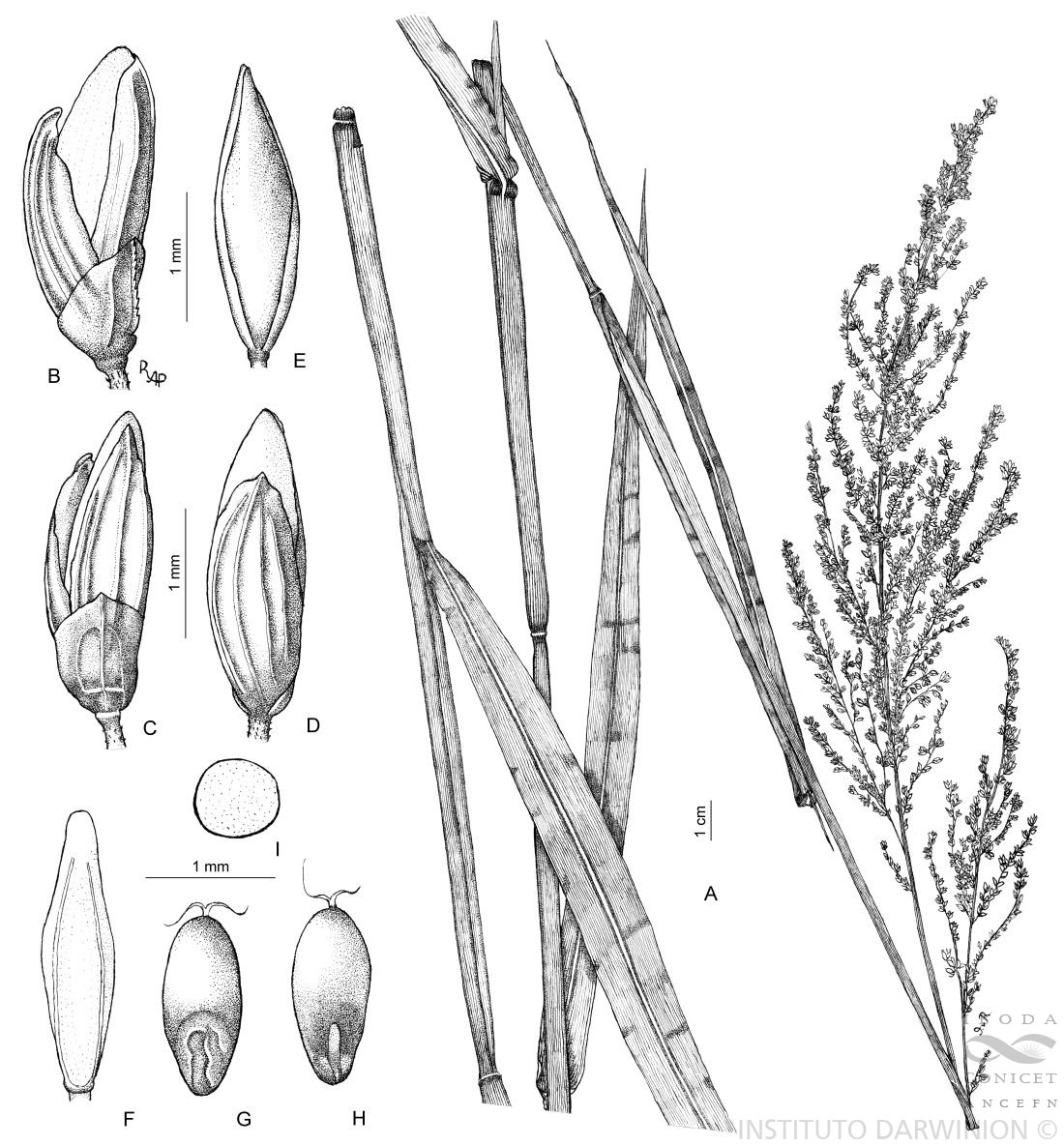 A. Caña florífera. B. Espiguilla vista lateral. C. Espiguilla vista ventral. D. Espiguilla vista dorsal. E. Antecio superior vista ventral. F. Pálea inferior. G. Cariopsis vista escutelar. H. Cariopsis vista hilar. I. Cariopsis en transcorte.