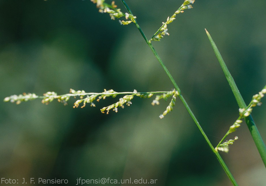 Plantas perennes; cañas decumbentes, arraigadas en los nudos inferiores a estoloníferas, luego ascendentes a erectas, de 15-80 cm de alto, simples o ramificadas en los nudos superiores; entrenudos de 2-15 cm de largo, glabros, huecos; nudos oscuros, pilosos a glabros; vainas de 2-11 cm de largo, papiloso-pilosas, con pelos tuberculados caducos, a glabras, los márgenes ciliados con pelos tuberculados, más hacia la porción distal; cuello piloso a glabro; lígulas de 0,4-0,8 mm de largo, membranáceas, cortamente laciniadas en la porción superior; láminas lanceoladas, de 4-30 cm x 3-14 mm, planas, de base redondeada a ocasionalmente subcordada, esparcidamente pilosas a glabras, los márgenes escabriúsculos. Inflorescencia terminal una panoja laxa a contraida de 6-29 x 2-14 cm; eje principal escabroso, anguloso, pulvínulos corta a largamente pilosos; ramificaciones de primer orden alternas a opuestas, ascendentes o divergentes, con espiguillas congestas en ramificaciones de segundo orden cortas; pedicelos de 0,5-1,4 mm de largo. Espiguillas angostamente elipsoides, de 1-1,7 x 0,4-0,6 mm, pilosas, con pelos caducos, a glabras, verdosas o con tintes violáceos; gluma inferior ovada, de 0,6-1,1 mm de largo, 2/5 a ½ del largo de la espiguilla, 3-nervia, el nervio medio escabroso hacia la porción superior; gluma superior de 1-1,6 mm de largo, cubriendo o no el ápice del antecio superior, 5-nervia, nervio medio escabroso; lemma inferior de 0,9-1,6 mm de largo, glumiforme, 5-nervia; pálea inferior oblonga, de 1,1-1,5 x 0,4-0,6 mm, membranosa, cortamente ciliada en los márgenes, ocasionalmente expandida a la madurez; flor inferior estaminada, estambres 3, ocasionalmente ausentes; antecio superior elipsoide, de 1-1,4 x 0,4-0,5 mm, escabroso hacia el ápice, papiloso, endurecido, lustroso; estambres 2, anteras de 0,3-0,7 mm de largo; cariopsis elipsoide, 0,8-0,9 x 0,4-0,6 mm; hilo oblongo, embrión ½ del largo de la cariopsis.