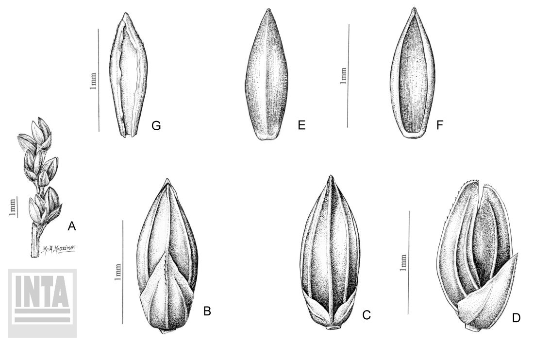 A. porción de inflorescencia, B-D. espiguilla, E.F. antecio, G. pálea inferior.