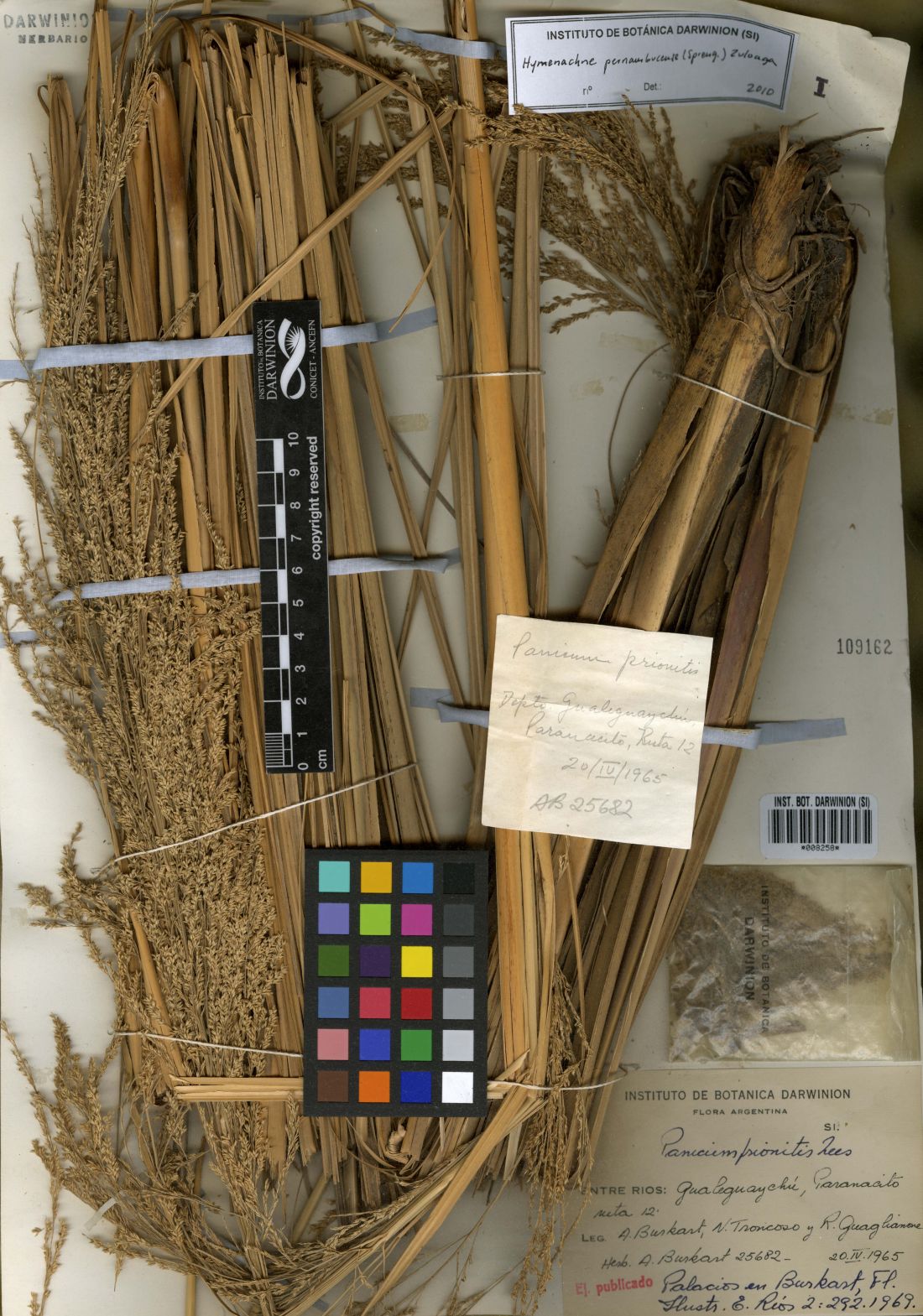 Planta perenne, rizomatosa, robusta, con cañas de 2-3 m de alto, erectas, ramificadas en los nudos medios y superiores; entrenudos de 8-22 cm de largo, 0,8-1 cm de diámetro, huecos, hirsutos a glabros; nudos pilosos a glabros, castaños; vainas de 8,7-18 cm de largo, glabros o densamente papiloso-pilosas con pelos caducos; lígulas de 0,5-1,3(-1,8) mm de largo, membranosas; cuello castaño; láminas lanceoladas, de 17-60 x 0,8-2 cm, subcordadas, atenuadas en el ápice, los márgenes escabriúsculos, esparcidamente pilosas a glabrescentes, el nervio medio manifiesto. Inflorescencia una panoja terminal laxa, de 27-40 x 8-12 cm; eje principal escabroso, con pelos cortos o sin los mismos; pulvínulos cortamente pilosos; espiguillas cortamente pediceladas y densamente agrupadas en ramificaciones de segundo orden, ramificaciones de primer orden ascendentes a divergentes, alternas a opuestas, ocasionalmente pseudoverticiladas; pedicelos escabrosos, de 0,4-2 mm de largo. Espiguillas largamente elipsoides, de 1,7-2,2(-2,5) x 0,4-0,8 mm, glabras; gluma inferior ovada, de 0,8-1,2 mm de largo, ½ del largo de la espiguilla, 3-nervia, el nervio medio escabroso hacia el ápice; gluma superior de 1,4-2,1 mm de largo, más corta que la lemma superior, 3-5 nervia, el nervio medio escabriúsculo; lemma inferior oblonga, de 1,7-2,2 mm de largo, 3-5 nervia, el nervio medio escabroso; pálea inferior usualmente ausente, cuando presente elíptica, hialina; flor inferior ausente; antecio superior largamente elipsoide, de 1,7-2,2 x 0,4-0,8 mm, membranoso, estramíneo, escabroso en el ápice de la lemma y pálea, el resto de la superficie con papilas simples y cuerpos de sílice; cariopsis elipsoide, de 0,9-1 x 0,5-0,6 mm.