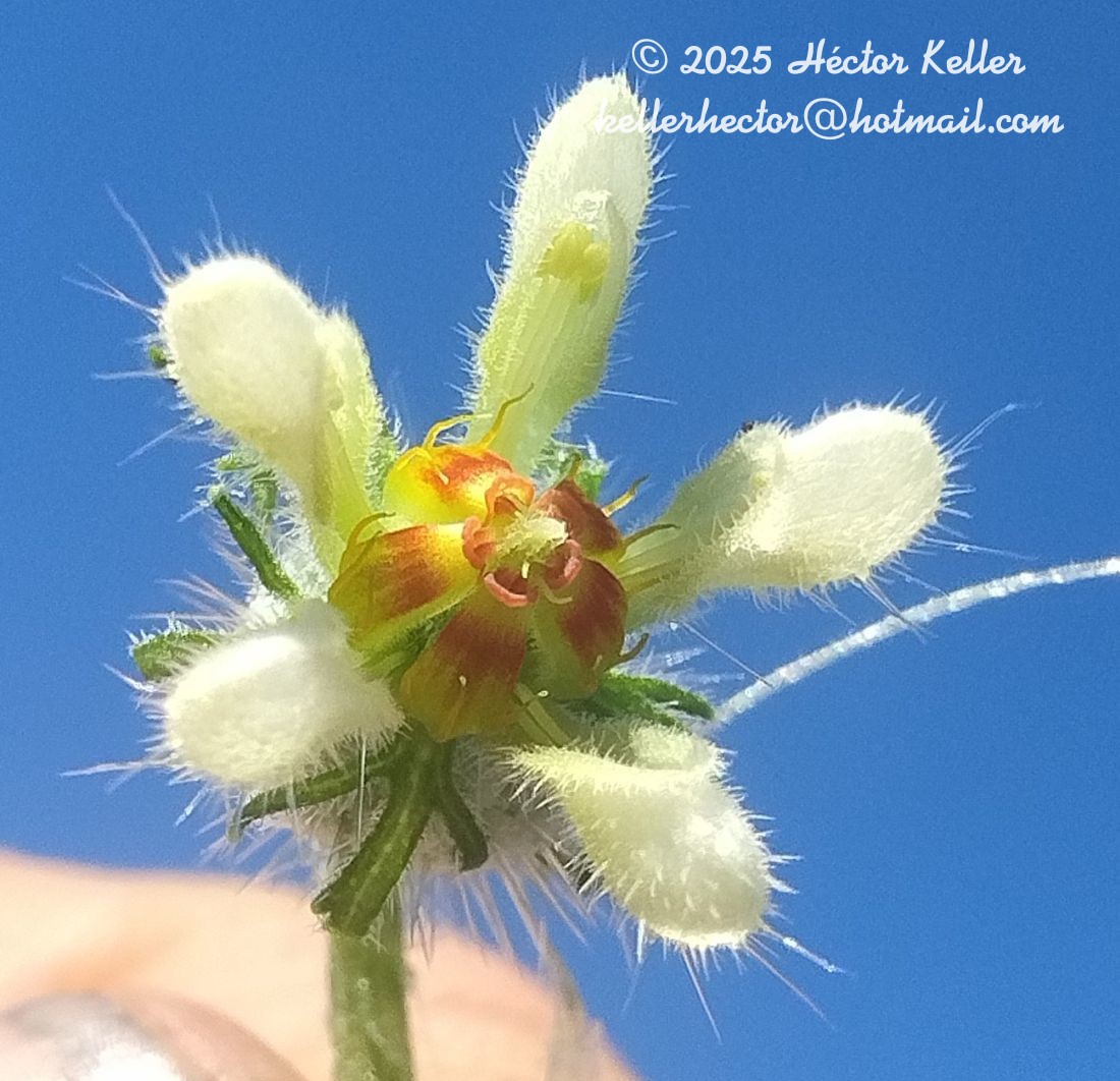 Hierbas perennes, decumbentes, de 30-70 cm de alto, cubiertas con tricomas gloquidiados, escabrosos y urticantes, tricomas glandulares inconspicuos; tallos estriados, cuadrangulares ramificados desde la base, hasta de 4 mm de diámetro. Hojas opuestas, decusadas, con peciolos hasta de 50 mm de largo; láminas de contorno ovado a anchamente ovado, de 2-10 × 1,5-10 cm, 3-sectas hasta 3-folioladas, con el segmento central más grande que los laterales, márgenes irregularmente dentados hasta lobulados o partidos, cada segmento, a veces, con 2 lóbulos basales, ápices acuminados, base de la lámina cordada. Inflorescencias en monocasios 1-floros, axilares (en realidad inflorescencias terminales fuertemente reducidas). Flores deflexas, con los pedicelos de 7-23 mm de largo (1/10-1/4 la longitud de la hoja subyacente), curvos hacia abajo; brácteas dos por flor, en la base del ovario, lineares, de 2,5-8 mm de largo; cáliz 5-lobado, con los lóbulos ovados o elípticos, de 2-5,5 × 1,5-2,5 mm, atenuados en ambos extremos, pinnatilobados hasta pinnatisectos, con 1 ó 2(-3) pares de segmentos o dientes; corola con 5 pétalos, cimbiformes, de 4-10 × 1,5-2,5 mm, semierguidos a patentes, blancos, con la uña bien diferenciada con 2 dientes, ápice cuculado, superficie abaxial pubescente; escamas nectaríferas 5, obovadas, de 2-3 × 1,5-2 mm, tricolores: amarillas, rojas y blancas o bicolores: rojas y amarillas, muy cóncavas, de borde superior recto y revoluto, bordes laterales ciliados y tercio inferior del dorso con 3 filamentos filiformes de 1-2 mm de largo; estaminodios 2 por escama, de 2-3,5 mm de largo, ligeramente expandidos en la base, con una prolongación filiforme, papilosos; estambres 35-55, con los filamentos de 2-6 mm de largo; anteras amarillas, elipsoideas, hasta de 0,5 mm de largo; ovario ovoideo, globoso a ligeramente elipsoideo, de 3-6,5 × 3-5,5 mm, cubierto por tricomas gloquidiados claviformes, al igual que tricomas escabrosos y urticantes, estilo de 3,5-5 mm de largo, subulado, con 5 regiones estigmáticas, pubescente en los 2/3 inferiores, placentas 5, parietales, óvulos numerosos. Frutos cápsulas subglobosas, siempre sinistrorsas, longitudinalmente dehiscentes en 10 segmentos (en material fresco, los 5 segmentos más anchos y los 5 más estrechos no forman crestas ni surcos evidentes), septífragas o septicidas, de 9-17 mm de diámetro, cubiertas por indumento semejante al del ovario, cuando inmaduras suculentas, cuando maduras membranáceas, con pericarpo grueso y esponjoso, pedicelo hasta de 15 mm de largo, deflexo. Semillas subelipsoideas o subobovoideas, de 2,5-3 × 1,2-1,5 mm, castañas a negras, testa fibrosa, rugosa y tuberculada.