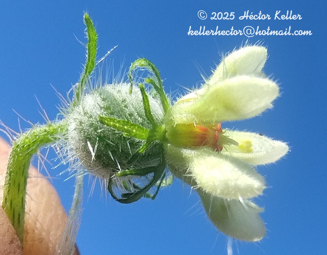 Hierbas perennes, decumbentes, de 30-70 cm de alto, cubiertas con tricomas gloquidiados, escabrosos y urticantes, tricomas glandulares inconspicuos; tallos estriados, cuadrangulares ramificados desde la base, hasta de 4 mm de diámetro. Hojas opuestas, decusadas, con peciolos hasta de 50 mm de largo; láminas de contorno ovado a anchamente ovado, de 2-10 × 1,5-10 cm, 3-sectas hasta 3-folioladas, con el segmento central más grande que los laterales, márgenes irregularmente dentados hasta lobulados o partidos, cada segmento, a veces, con 2 lóbulos basales, ápices acuminados, base de la lámina cordada. Inflorescencias en monocasios 1-floros, axilares (en realidad inflorescencias terminales fuertemente reducidas). Flores deflexas, con los pedicelos de 7-23 mm de largo (1/10-1/4 la longitud de la hoja subyacente), curvos hacia abajo; brácteas dos por flor, en la base del ovario, lineares, de 2,5-8 mm de largo; cáliz 5-lobado, con los lóbulos ovados o elípticos, de 2-5,5 × 1,5-2,5 mm, atenuados en ambos extremos, pinnatilobados hasta pinnatisectos, con 1 ó 2(-3) pares de segmentos o dientes; corola con 5 pétalos, cimbiformes, de 4-10 × 1,5-2,5 mm, semierguidos a patentes, blancos, con la uña bien diferenciada con 2 dientes, ápice cuculado, superficie abaxial pubescente; escamas nectaríferas 5, obovadas, de 2-3 × 1,5-2 mm, tricolores: amarillas, rojas y blancas o bicolores: rojas y amarillas, muy cóncavas, de borde superior recto y revoluto, bordes laterales ciliados y tercio inferior del dorso con 3 filamentos filiformes de 1-2 mm de largo; estaminodios 2 por escama, de 2-3,5 mm de largo, ligeramente expandidos en la base, con una prolongación filiforme, papilosos; estambres 35-55, con los filamentos de 2-6 mm de largo; anteras amarillas, elipsoideas, hasta de 0,5 mm de largo; ovario ovoideo, globoso a ligeramente elipsoideo, de 3-6,5 × 3-5,5 mm, cubierto por tricomas gloquidiados claviformes, al igual que tricomas escabrosos y urticantes, estilo de 3,5-5 mm de largo, subulado, con 5 regiones estigmáticas, pubescente en los 2/3 inferiores, placentas 5, parietales, óvulos numerosos. Frutos cápsulas subglobosas, siempre sinistrorsas, longitudinalmente dehiscentes en 10 segmentos (en material fresco, los 5 segmentos más anchos y los 5 más estrechos no forman crestas ni surcos evidentes), septífragas o septicidas, de 9-17 mm de diámetro, cubiertas por indumento semejante al del ovario, cuando inmaduras suculentas, cuando maduras membranáceas, con pericarpo grueso y esponjoso, pedicelo hasta de 15 mm de largo, deflexo. Semillas subelipsoideas o subobovoideas, de 2,5-3 × 1,2-1,5 mm, castañas a negras, testa fibrosa, rugosa y tuberculada.