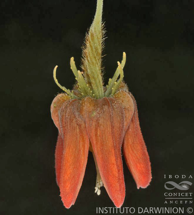 Hierbas volubles, hasta de 2,5 m de alto, inermes o muy poco urticantes. Tallos provistos de setas cortas, retrorsas entremezcladas con tricomas gloquidiados; corteza castaña. Hojas con pecíolos de 2-5 cm; pinnadas, 3(-5)- folioladas, raro simples, en este caso 2-3-lobadas a 2-3-sectas; folíolos laterales subopuestos (raro opuestos o alternos), desiguales, brevemente peciolulados o sésiles; folíolo terminal ovado u ovado-oblongo, entero, 3-lobado a 3-secto, acuminado; margen denticulado provisto de glándulas en el extremo de los dientes y setas cortas retrorsas; haz provisto de setas largas entremezcladas con abundantes tricomas escábridos, envés densamente cubierto por tricomas gloquidiados y setas cortas esparcidas. Inflorescencias laxas, monocasios. Flores péndulas, 5-meras. Pedicelos gráciles, de 8-20 cm. Receptáculo oblongo, atenuado hacia la base, de 8-15 x 2,5 mm; provisto de abundantes setas y tricomas gloquidiados. Cáliz expandido a deflexo; sépalos lineares, algo dilatados en la base, enteros o irregularmente denticulados y provistos de una glándula apical en cada diente, de 8-12 x 0,8-1 mm; densamente cubiertos por pelos escábridos en ambas caras. Corola acampanada; pétalos ovados, cimbiformes, ápice cuculado, márgenes alados hacia la base, angulosos en la base, dorsalmente 3-quillado, de 20-30 x 10-12 mm; dorsalmente provisto de setas antrosas y pelos gloquidiados, interior minutamente piloso; color rojo a rojo-grisáceo. Escamas nectaríferas cimbiformes, ligeramente atenuadas hacia los extremos, dorsalmente 3-nervada, nervios laterales prominentes, de 7-8 x 4 mm; verde amarillentas; glabrescentes, margen ciliado; ápice engrosado, no diferenciado; cuello hemisférico a veces con dos escotaduras, papiloso; apéndices dorsales 3, subapicales, lineares, acanalados ventralmente, rígidos, ca. 4 mm, extremo distal rojizo. Estaminodios de 13-16 mm, ápice color amarillo claro, base amarillo-verdosa; ápice rojizo, papiloso; lengüeta basal pilosa. Cápsula péndula, fusiforme, alargada, espiralada, de 4-7,5 x 0,5-1 cm, pilosa.