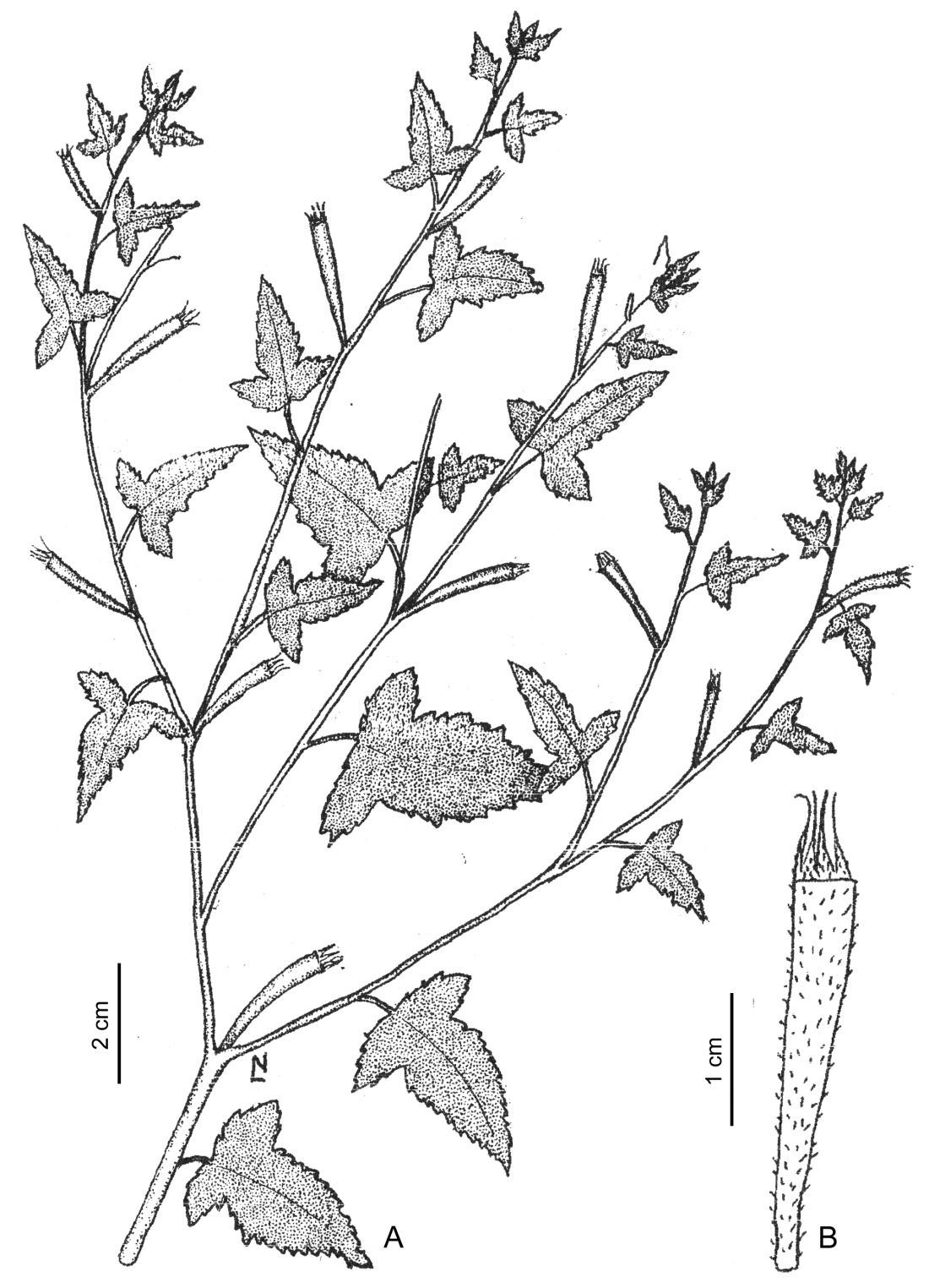 A. Rama con flores y frutos. B. Fruto. Tomado de Fl. Valle del Lerma, Aportes Bot. Salta, Ser. Fl. 8(11): lám. 1. 2008.