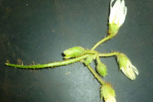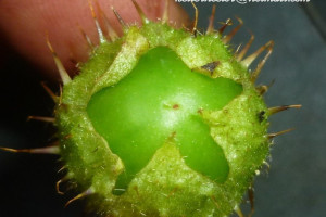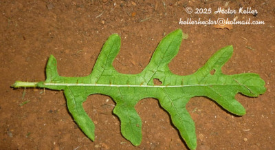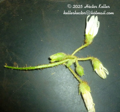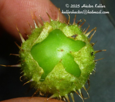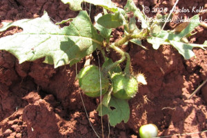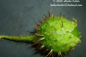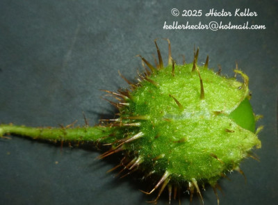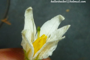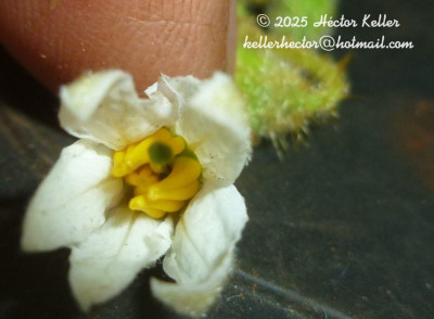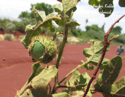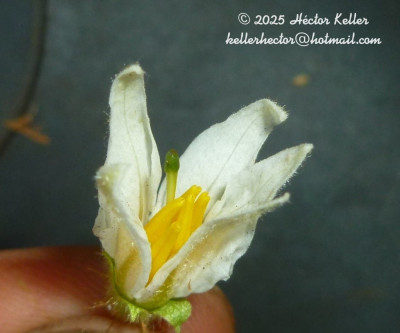 Hierbas perennes, andromonoicas, hasta de 60 cm de alto, con raíces gemíferas; tallos ramificados desde la base, cubiertos por tricomas estrellados corta a largamente estipitados, con acúleos aciculares esparcidos o abundantes, con formas de transición entre tricomas estrellados y acúleos (acúleos jóvenes con varios rayos ascendentes en su ápice), y con tricomas eglandulares y glandulares. Hojas pecioladas; láminas desde enteras y ovadas hasta largamente elípticas, base cuneada, frecuentemente repando-lobadas, a veces liradas o pinnatífidas, con 3-5 pares de lóbulos redondeados; epifilo con tricomas estrellados sésiles con 4-6-8 rayos laterales y un rayo central igual o algo menor; hipofilo con indumento similar; ambas caras con algunos acúleos aciculares esparcidos. Inflorescencia pedunculada, no ramificada, con 1(-3) flores perfectas y (1-)3(-5) flores estaminadas. Cáliz con lóbulos triangulares agudos y tubo aculeado; corola semi-estrellada, blanca, ca. 4 cm de diámetro, lóbulos reflexos; anteras amarillas, iguales, de 10-11 mm. Baya globosa, ca. 2 cm de diámetro, amarillo-anaranjada, cubierta casi completamente por el tubo calicinal acrescente y armado; semillas lenticulares, de 3 mm, castañas, lisas
