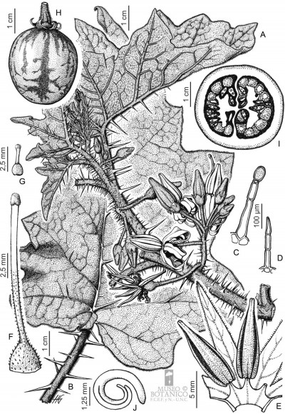 Arbustos andromonoicos, hasta de 2 m de alto, con raíces gemíferas; tallos erectos, cubiertos de tricomas simples eglandulares, abundantes tricomas glandulares y acúleos aciculares y subaciculares densos. Hojas con pecíolos aculeados, acúleos subaciculares; laminas ovadas a elípticas, base cordada, con 3-5 lóbulos agudos a cada lado, éstos a su vez lobulados; epifilo con tricomas eglandulares, 1-3-celulares (raramente algún tricoma multiangulado), tricomas glandulares y acúleos aciculares; hipofilo con tricomas multiangulados densos de 4-9 rayos, (a veces un rayo central algo mayor), y con tricomas glandulares y eglandulares. Inflorescencia pedunculada, no ramificada, con (3-)5(-6) flores perfectas y (0-)2(-5) flores estaminadas. Cáliz generalmente inerme, lóbulos deltoides u ovados, mucronados, tubo muy corto; corola estrellada, ca. 3 cm de diámetro, violácea; anteras de 3 mm, amarillas. Baya 1(-2) por inflorescencia, globosa, hasta de 3 cm de diámetro, amarilla a la madurez, pericarpo esponjoso; semillas ± 250 por fruto, lenticulares, de 3,5-5 mm, castañas, lisas.