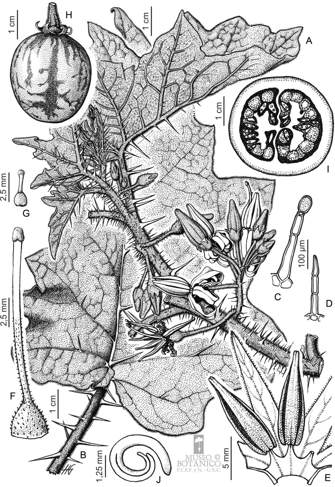 A. Rama florífera. B. Hoja. C. Tricoma glandular de hoja. D. Tricoma eglandular de hoja. E. Sector de corola desplegada. F. Gineceo longistilado. G. Gineceo brevistilado. H. Fruto. I. Fruto, corte transversal. J. Embrión.