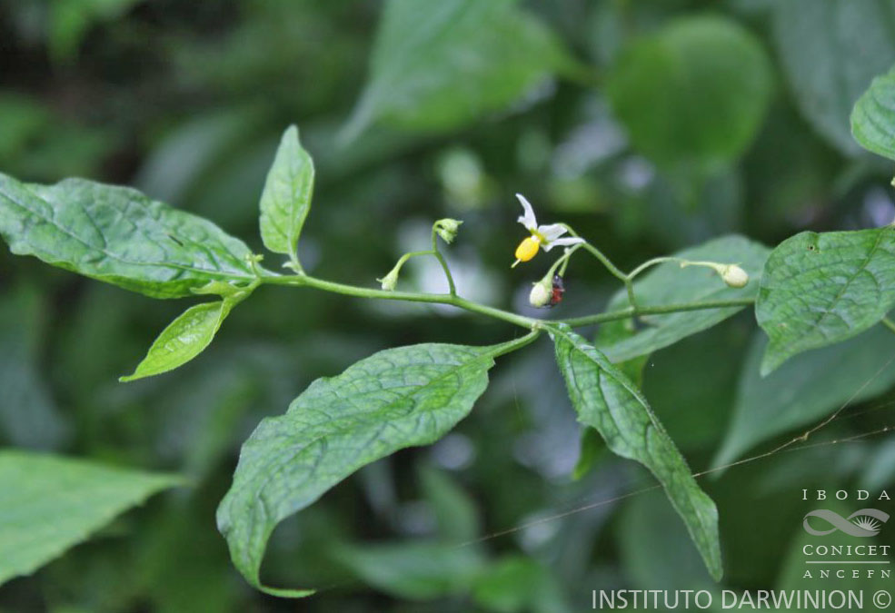 Hierbas a arbustos hasta de 1,5(-2) m de alto; tallos adultos no ramificados desde la base, glabros a glabrescentes; tallos jóvenes aristados, sin procesos espinulosos, con abundantes tricomas simples, eglandulares, curvados, antrorsos. Unidades simpodiales 1-foliadas o 2-foliadas. Hojas pecioladas; pecíolos de (0,8-)1-3 cm, glabrescentes o pubescentes; láminas ovadas, ovado-romboidales, elípticas o angostamente elípticas, raro anchamente ovadas, base desigual, atenuada, ápice agudo, margen entero o completamente dentado o con sólo un par basal de lóbulos, o irregularmente dentado-lobado a cada lado, con 1-5 lóbulos pequeños, desiguales, de 4-19 × 2-9,5 cm; epifilo glabrescente a pubescente; hipofilo pubescente a densamente pubescente, raro con láminas glabrescentes, sólo con tricomas densos en los nervios; nervios principales 4-5 pares, marcados abaxialmente. Inflorescencia extra-axilar, bifurcada a varias veces ramificada, con más de 10 flores y hasta ca. 80-100 flores, cada ramificación subumbeliforme o alargada; pedúnculos delgados, pubescentes, de 2-6 cm. Botones florales oblongoelipsoides, con pubescencia blanquecina densa; pedicelos de 0,75-1 cm, articulados en la base sobre una pequeña plataforma; cáliz campanulado, de 1,6-2,75(-3,5) mm, con pubescencia eglandular antrorsa, lóbulos angosta o anchamente triangulares agudos, pequeños, que aparentan ser profundos por desgarramiento en la antesis, de 0,5-1 × 0,3-0,6 mm; corola profundamente estrellada, de 6,5-12(-15) mm, blanca o lilacina, ambas con anillo verdoso o amarronado en la base el limbo, lóbulos angostamente triangulares, agudos, de 4,7-5,2 × 1,8-2,25 mm, reflexos en antesis, pubescentes por fuera; filamentos adheridos a 1-1,5 mm de la base de la corola, porción libre de 1-1,3 mm, muy pubescente, anteras largamente elipsoides, muy angostas, de color amarillo pálido, de 3,6-5,5 × 0,6-1,5 mm; gineceo de 9-9,7 mm, ovario ovoide, glabro, estilo cilíndrico, de 8-8,5 mm, sobrepasando a las anteras hasta en 1,5-2 mm, curvado cerca del ápice, pubescente en su mitad basal, con tricomas eglandulares largos, estigma capitado. Baya globoso-comprimida, de 7-8 mm de diámetro, negro-azulada cuando madura, pericarpo con abundantes esclerosomas; pedicelos fructíferos deflexos, de 9-13 mm, ensanchados en la inserción con la baya; cáliz fructífero apenas acrescente, los lóbulos adpresos a la baya; semillas más de 50 por fruto, subglobosas a reniformes, de 0,9-1,2 × 0,75-1,2 mm, amarillo-pálidas, tegumento foveolado.
