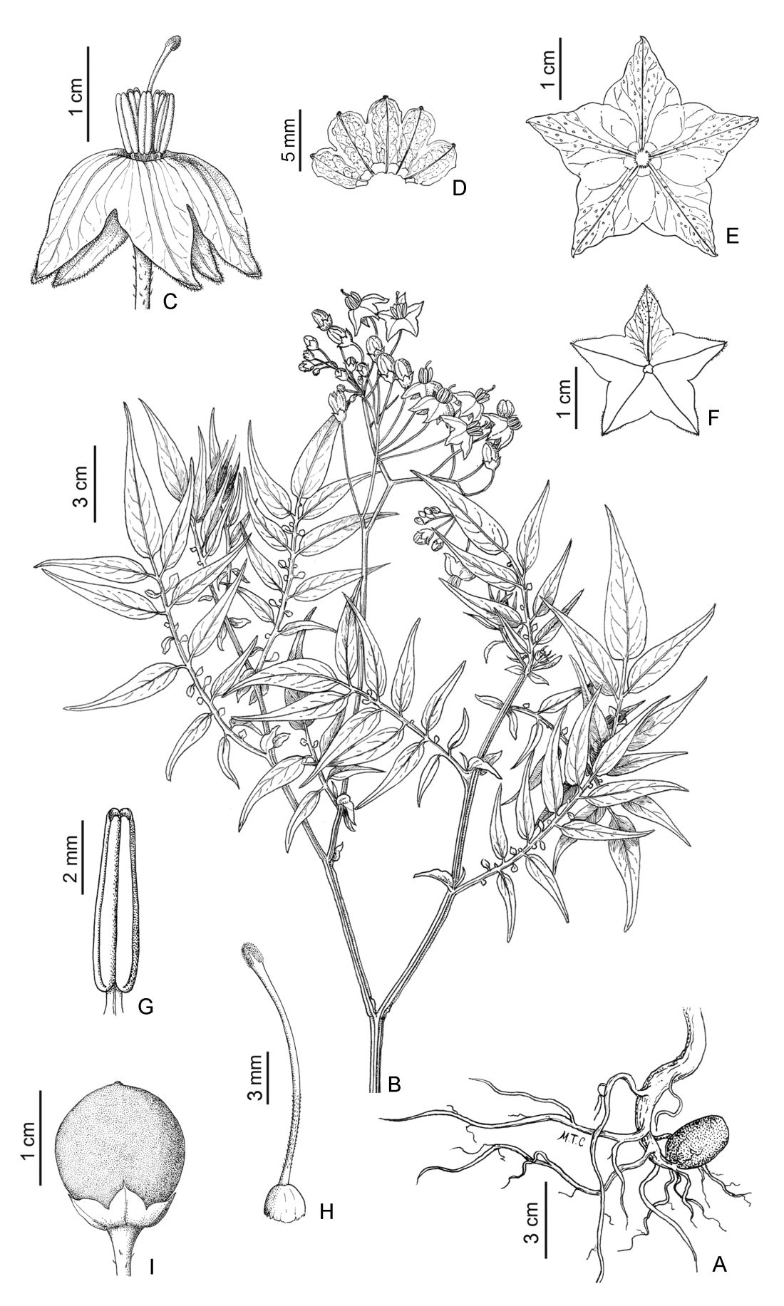 A. Raíz y tubérculo. B. Rama florífera. C. Flor. D. Cáliz desplegado. E-F. Corolas, vista superior. G. Estambre, vista ventral. H. Gineceo. I. Fruto (D, E, F. Reproducido de Correll, 1962).