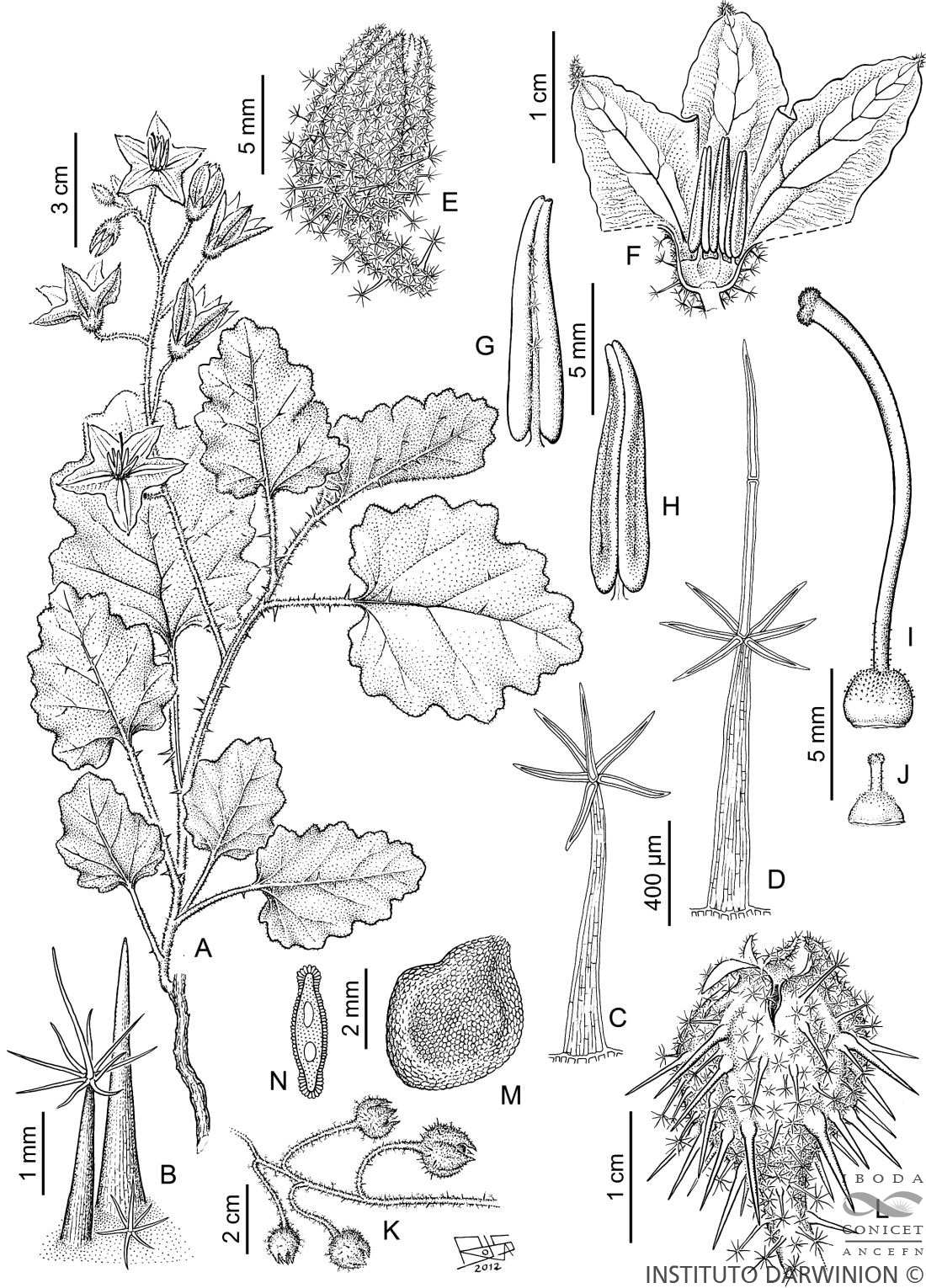 A. Rama florífera. B. Acúleo y tricoma estrellado. C-D. Tricomas estrellados del tallo. E. Botón floral. F. Corola desplegada. G. Antera, vista dorsal. H. Antera, vista ventral. I. Gineceo longistilado. J. Gineceo brevistilado. K. Infrutescencia. L. Fruto. M. Semilla. N. Semilla, corte transversal.
