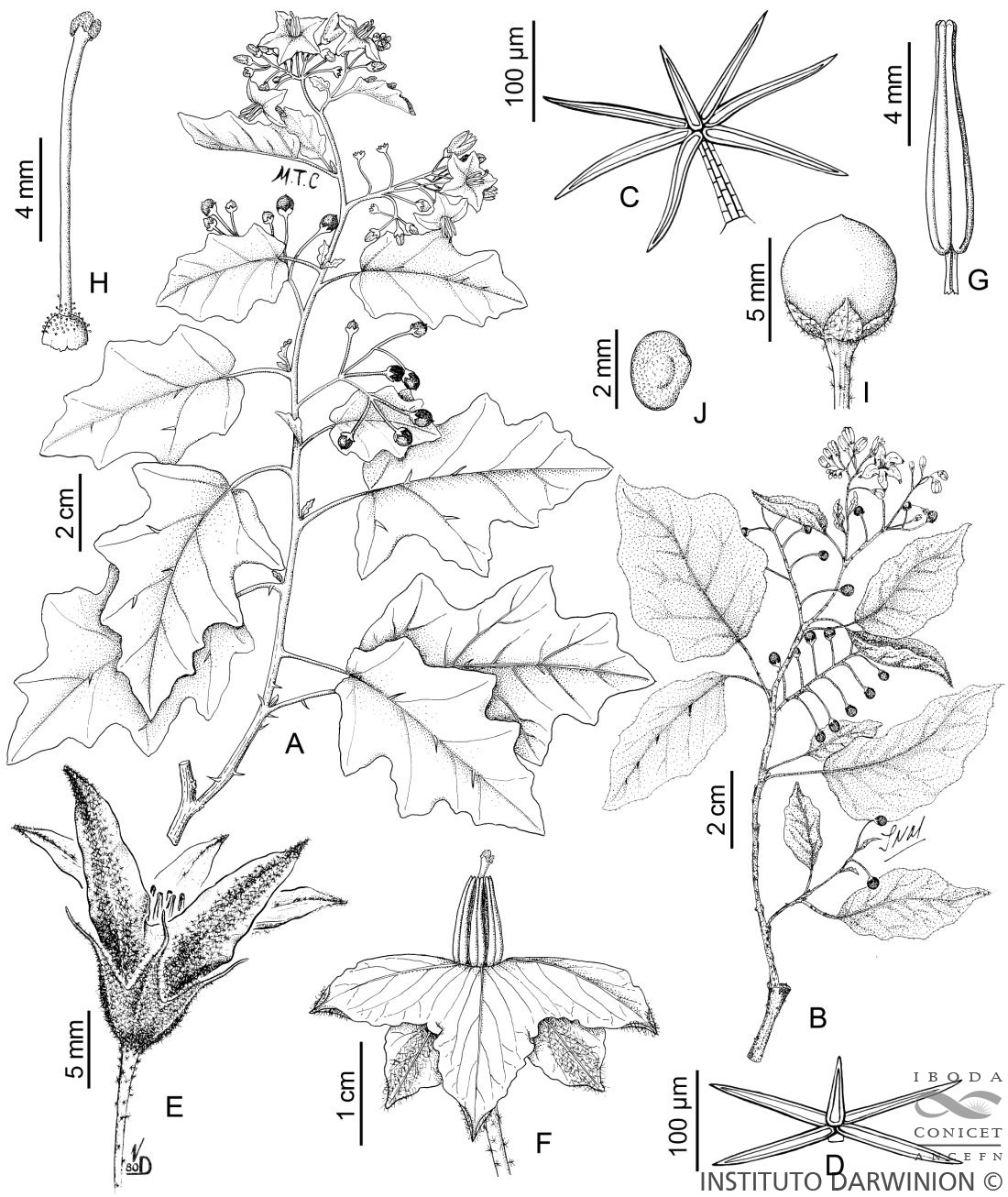 A-B. Ramas con flores y frutos. C-D. Tricomas estrellados del hipofilo. E. Flor. F. Flor, con lóbulos reflexos. G. Estambre, vista ventral. H. Gineceo. I. Fruto. J. Semilla.