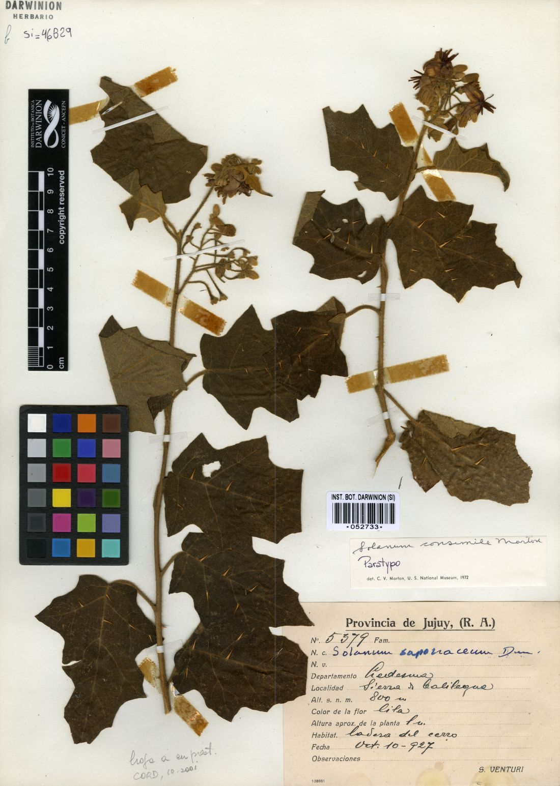 Observaciones: Nombres vulgares. «Codo-codo», «espino», «lavaplato». En el límite norte de su rango de ditribución, Solanum consimile es simpátrica con S. caricaefolium Rusby. Ambas especies, muy similares, aparentemente se hibridan (http:/ /www.nhm.ac.uk/research-curation/projects/solanaceaesource). Se diferencian porque en Solanum caricaefolium las hojas son más grandes, anchas y glabrescentes y la corola es blanca, mientras que en S. consimile las hojas son más pequeñas, lanceoladas, con abundantes tricomas estrellados estipitados y la corola es desde blanca hasta violeta.