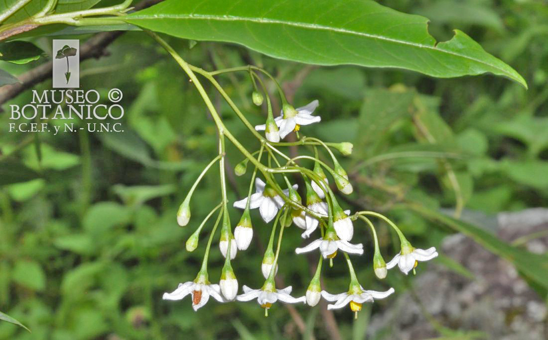 Árboles pequeños o arbustos, de 1,5-5 m de alto, con ramas arqueadas; tallos glabros a densamente pubescentes, con tricomas simples o dendríticos de 0,5-1 mm, a menudo fuertemente alados por la base decurrente de las hojas, alas de 5 mm de ancho; corteza de los tallos más viejos castaño-rojizo, oscuro y brillante. Unidades simpodiales plurifoliadas. Hojas simples; pecíolos de 0,7-2 cm, glabros o pubescentes, nunca volubles; láminas angostamente elípticas a lanceoladas, de (3,5-)6-15 × 1,2-5 cm, base atenuada, ápice acuminado, margen entero, a veces revoluto, membranáceas a ligeramente carnosas; epifilo glabro o escasamente (a veces densamente) pubescente; hipofilo con mechones densos de tricomas dendríticos en la axila de los nervios, estos tricomas en ocasiones se extienden a lo largo del nervio medio o en la lámina y en las hojas más densamente pubescentes; nervios primarios 10-15(-20) pares. Inflorescencia terminal o lateral, de 4-15 cm, varias veces ramificada, con 10-60 flores, glabra o con tricomas simples o dendríticos, más densos en los extremos de las ramificaciones y en la inserción de la flor; pedúnculo de 1,5-3,5 cm. Pedicelos de 1-1,2 cm × ca. 0,5 mm de diámetro en la base y ca. 1 mm en el ápice, erectos a nutantes, glabros, articulados en la base e insertos en una corta manga; cicatrices de los pedicelos mayormente agrupadas en los extremos de las ramificaciones de la inflorescencia sobre pequeñas plataformas o irregularmente espaciadas cada 2-5 mm, más apretadamente en la base; botones ovoide-puntiagudos o turbinados con una protuberancia apical; tubo calicinal cupuliforme, de 1,5-2,5 mm, enangostándose abruptamente hacia el pedicelo, lóbulos de 1,5-2 mm, cuadrados, apiculados, puntas muy pubescentes con tricomas simples que se extienden adaxialmente, superficie adaxial densamente papilosa; corola estrellada, lobada en 1/2 a 3/4 de su longitud, blanca, a menudo con manchas purpúreas, de 1,8-2 cm de diámetro, lóbulos ca. 7 × 5 mm, con las puntas cuculadas, densamente pubescentes; filamentos libres de 0,5-1 mm, glabros, anteras de 4,5-5,5 × 1-1,5 mm; estilo de 6,5- 7 mm, glabro, estigma diminutamente capitado a ligeramente clavado. Baya negra o negro-verdosa, de 1-1,2 cm, pericarpo delgado y brillante, glabro; pedicelo fructífero de 1,5-1,7 cm y ca. 1,5 mm de diámetro en la base, leñoso, más o menos nutante; semillas 20-40 por baya, de 2,5-3 × 2-2,5 mm, castaño-rojizas o amarillo- pálidas, testa con células cuadradas cuyas paredes se desintegran por lo que las semillas parecen pilosas.