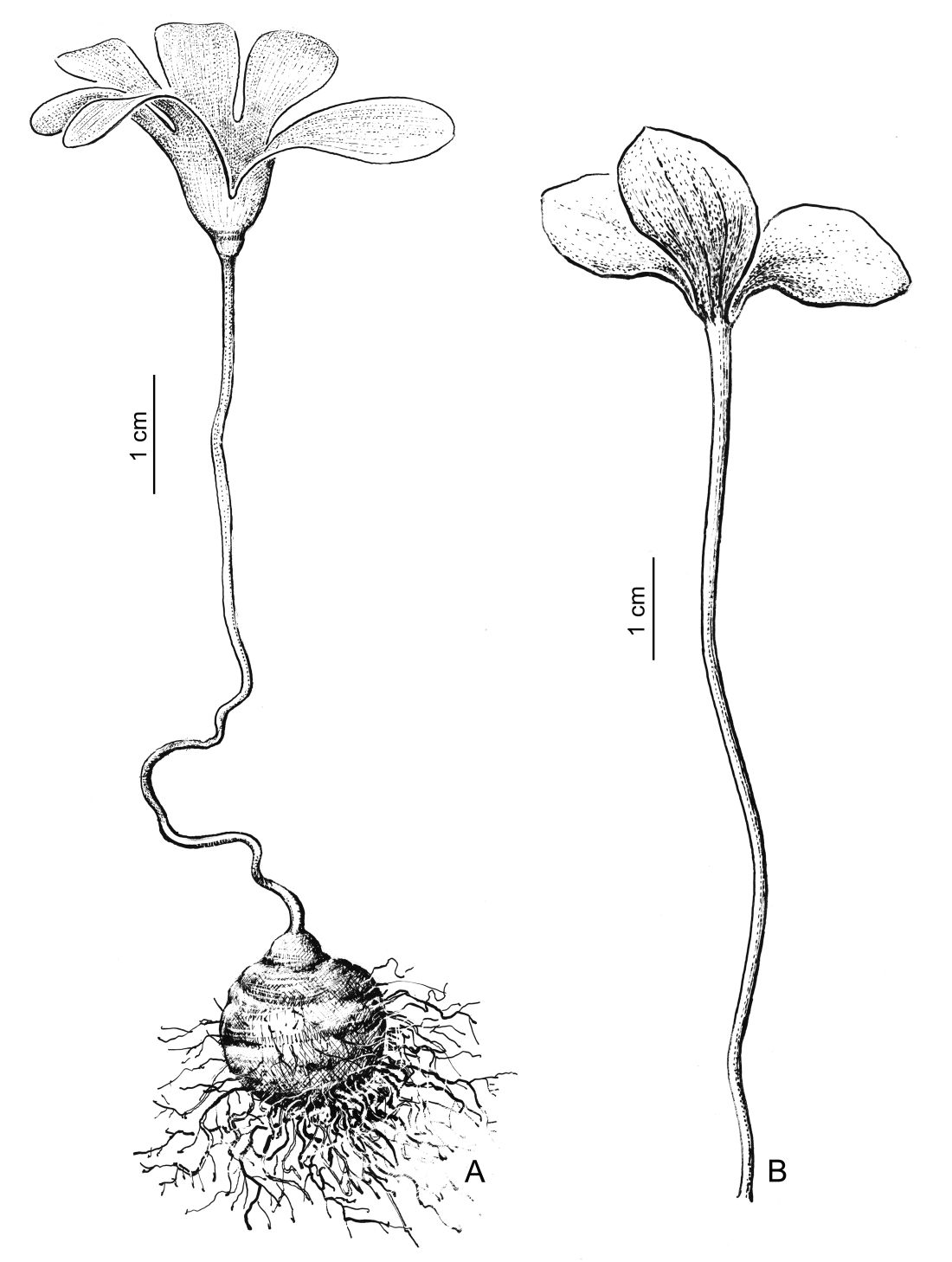 Hierbas levemente pubescentes o glabrescentes; tubérculos ovoides, que dejan restos escariosos sobre el escapo. Hojas con pecíolos menores a 20 cm de largo y hasta de 6 mm de diámetro, estriados; láminas 3-folioladas, con segmentos obovados a suborbiculares, enteros, levemente pubescentes en la cara abaxial. Flor solitaria; involucro hasta de 9 cm de diámetro con la porción basal pubescente, 2-fidos o 2-partidos, a su vez cada segmento 3-6-fidos o partidos, espatulados u obovado-espatulados; escapo menor a 20 cm de largo y hasta de 6 mm de diámetro, estriados; sépalos petaloideos 11-16, de 18-23 × 3-6 mm, de ápice obtuso o agudo, cara dorsal pubescente con tricomas esparcidos, largos, especialmente en la base o más o menos glabrescentes, cara ventral glabra; estambres 35-80, filamentos aplanados, ensanchados, anteras con tecas lineares; carpelos 15-55, pubescentes, atenuados en estilos algo curvos, papilosos; receptáculo esferoidal, hasta de 4 mm de diámetro, grueso, con aspecto de panal. Frutos aquenios de 4,5-6 mm de largo, curvos, lisos o rugosos, con pubescencia blanca o amarillenta, atenuándose en rostro largo, casi recto.