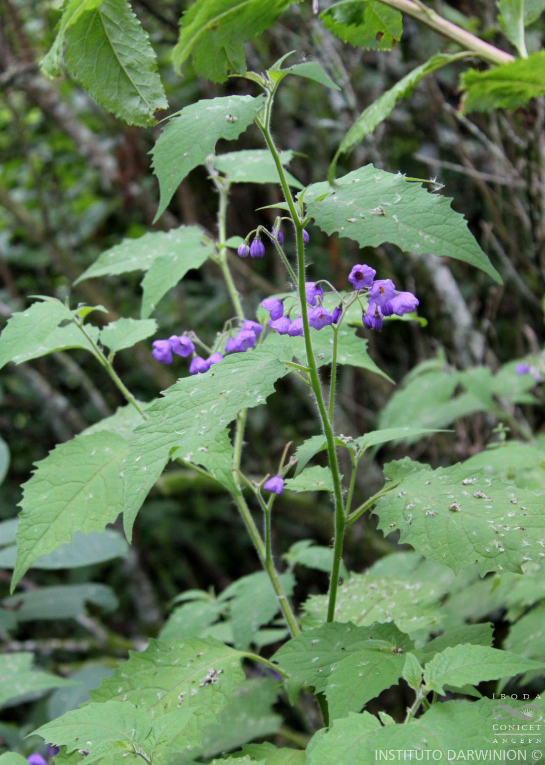 Hierbas perennes o subarbustos de 0,5-2 m de alto, ligeramente malolientes, víscido-pubescentes, con tricomas glandulares simples y largos (pie con 5-8 células, cabezuela oscura, elíptica y 1-celular) y con tricomas eglandulares (con 2-6 células); tallos huecos, erectos, aristados longitudinalmente. Unidades simpodiales 2-foliadas o 1-foliadas cerca del ápice. Hojas largamente pecioladas; pecíolos de 1,5-4,5 cm; láminas ovadas o ligeramente elípticas, de (5-)7-15(-16) × (2,2-)3-8,2 cm, base generalmente desigual y atenuada, ápice acuminado, márgenes serrulados, con 7-13(-15) pares de dientes desiguales y lisos, orientados hacia arriba, senos angostos; epifilo e hipofilo con escasos a abundantes tricomas antrorsos sobre la lámina y con tricomas glandulares largos, patentes, flexuosos y abundantes sobre el nervio central y los nervios secundarios. Inflorescencia extra-axilar, bifurcada o hasta con 4 ó 5 ramas, con 11-30 (hasta 52) flores; pedúnculos de 1,1-6,4(-7,3) cm. Botones florales obovoides; cicatrices de los pedicelos espaciadas entre 2 y 3,5 mm; pedicelos de 0,7-1,9 cm; cáliz de (2,5-)3,2-5,2(-6) mm, lóbulos triangulares, ligeramente desiguales, 2 a 3,5 veces más cortos que el tubo, de (0,8-)1,2-2,2 mm, pubescentes, con los mismos tricomas glandulares largos del tallo y tricomas con pie corto (pie 2-celular, cabezuela globosa pluricelular) escasos; corola campanulada, de 10-14 mm de largo × 13-18 mm de diámetro, violácea o violeta intenso, con una fragancia delicada, y tricomas eglandulares escasos sobre los ápices y bordes, lóbulos reducidos a 5 puntas inconspicuas; filamentos adheridos a ca. 1,6 mm de la base de la corola, sector libre de los filamentos ca. 1-2 mm, pubescente, con tricomas eglandulares, anteras elipsoides, de 3,7-4 × 1-1,2 mm, dorsalmente papilosas; gineceo ca. 9,8-12 mm, ovario ovoide, glabro, estilo de 7,5-10 mm, sobrepasando a las anteras en 3-4 mm, pubescente sólo en su cuarto basal u ocasionalmente en su mitad basal, con tricomas eglandulares, estigma capitado-bilobado. Baya globosa, ca. 5 mm de diámetro; pericarpo hasta con 14 esclerosomas pequeños, de 0,5-0,7 mm de diámetro; cáliz fructífero algo acrescente, con ca. 30 semillas; semillas maduras no vistas.