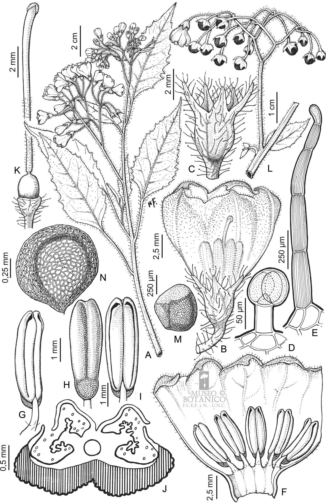 A. Rama florífera. B. Flor. C. Cáliz. D-E. Tricomas glandulares de cáliz. F. Corola desplegada. G. Estambre, vista lateral. H. Estambre, vista dorsal. I. Estambre, vista ventral. J. Antera madura, corte transversal. K. Gineceo. L. Infrutescencia. M. Esclerosoma. N. Semilla.