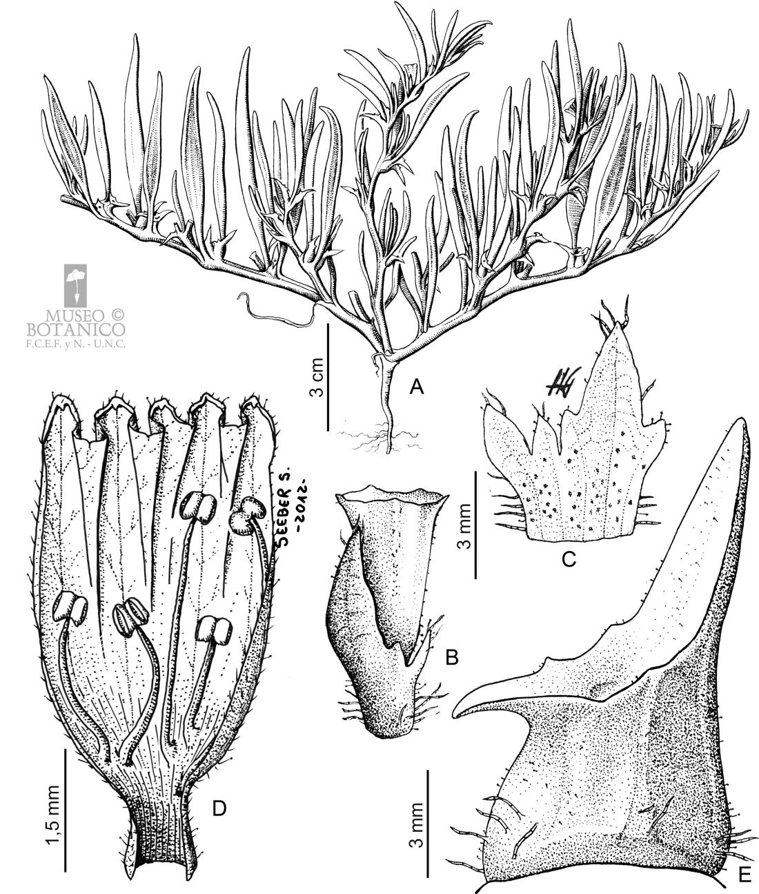 Hierbas anuales, decumbentes, casi glabras; tallos ca. 40 cm de largo. Pecíolos muy cortos o hasta de 15 mm; láminas linearovadas, 5-8 veces más largas que anchas, de 15-35 × 3,5-5 mm, con bordes levemente inflexos. Flores sésiles, 2 por nudo; cáliz ca. 4 mm; lóbulos foliáceos, 3 muy breves y los 2 más largos desiguales (uno de 2,5-3 × 1-1,25 mm y el otro de 1 × 0,5 mm); corola generalmente blanca, de 5-6 mm, limbo breve de 2 mm de diámetro; pares inferior y superior de estambres ca. 2 mm, el impar ca. 1 mm, filamentos con tricomas eglandulares pequeños y escasos, anteras ca. 0,3 mm de diámetro; gineceo ca. 3 mm. Fruto ca. 5 × 2 mm, incrustado en las axilas de las hojas; cáliz fructífero 5-nervado, lóbulos foliáceos; semillas de 2,5-3 × 1 mm; embrión recto o levemente curvo.