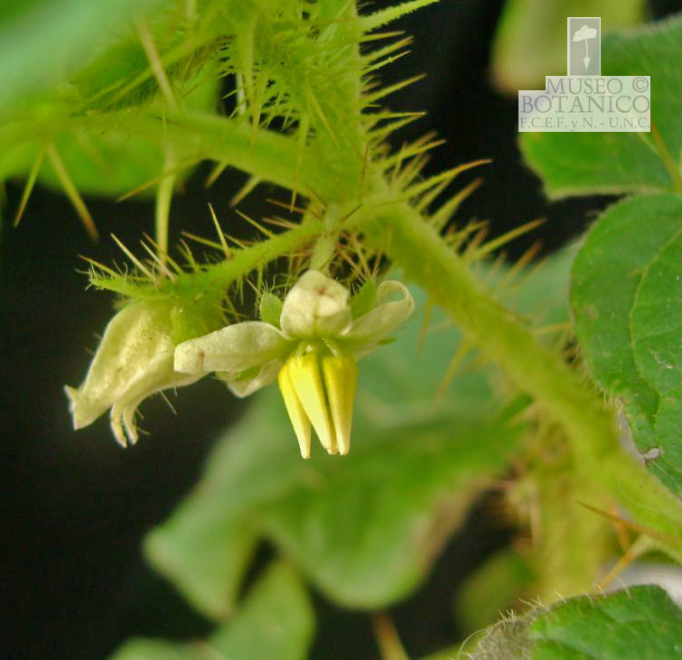 Arbustos andromonoicos, apoyantes, con tallos hasta de 80 cm de largo, con tricomas simples eglandulares 1-3-celulares y algunos glandulares, y abundantes acúleos aciculares. Hojas enteras o sinuadas; pecíolos con acúleos subaciculares; láminas ovadas, base cordada, margen ciliado, acúleos aciculares en ambas superficies; epifilo con tricomas simples eglandulares 1- 3-celulares, densos a esparcidos; hipofilo con tricomas estrellados sésiles con 4 rayos laterales y uno central de igual longitud, y con algunos tricomas simples eglandulares. Inflorescencia con pedúnculo muy reducido, con (1-)2(-3) flores, sólo 1 perfecta. Cáliz piloso y aculeado, lóbulos triangulares; corola blanca; anteras de 3 mm, amarillas a blancuzcas. Baya solitaria, a veces de a pares, globosa, ca. 2 cm de diámetro, amarilla o verde-grisácea, pericarpo esponjoso; semillas ca. 80 por fruto, fuertemente comprimidas, hasta de 5-5,5 mm, aladas.