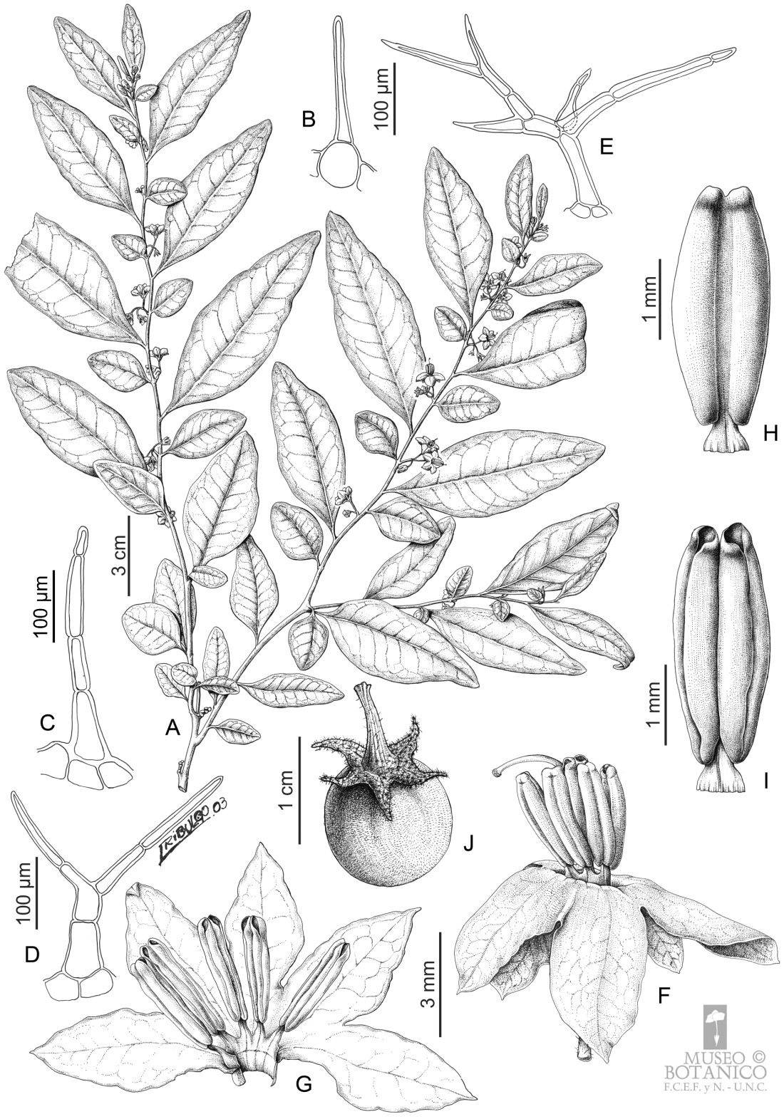 A. Rama florífera. B-C. Tricomas simples de hoja. D. Tricoma bifurcado de hoja. E. Tricoma dendrítico de hoja. F. Flor. G. Corola desplegada. H. Estambre, vista dorsal. I. Estambre, vista ventral. J. Fruto.