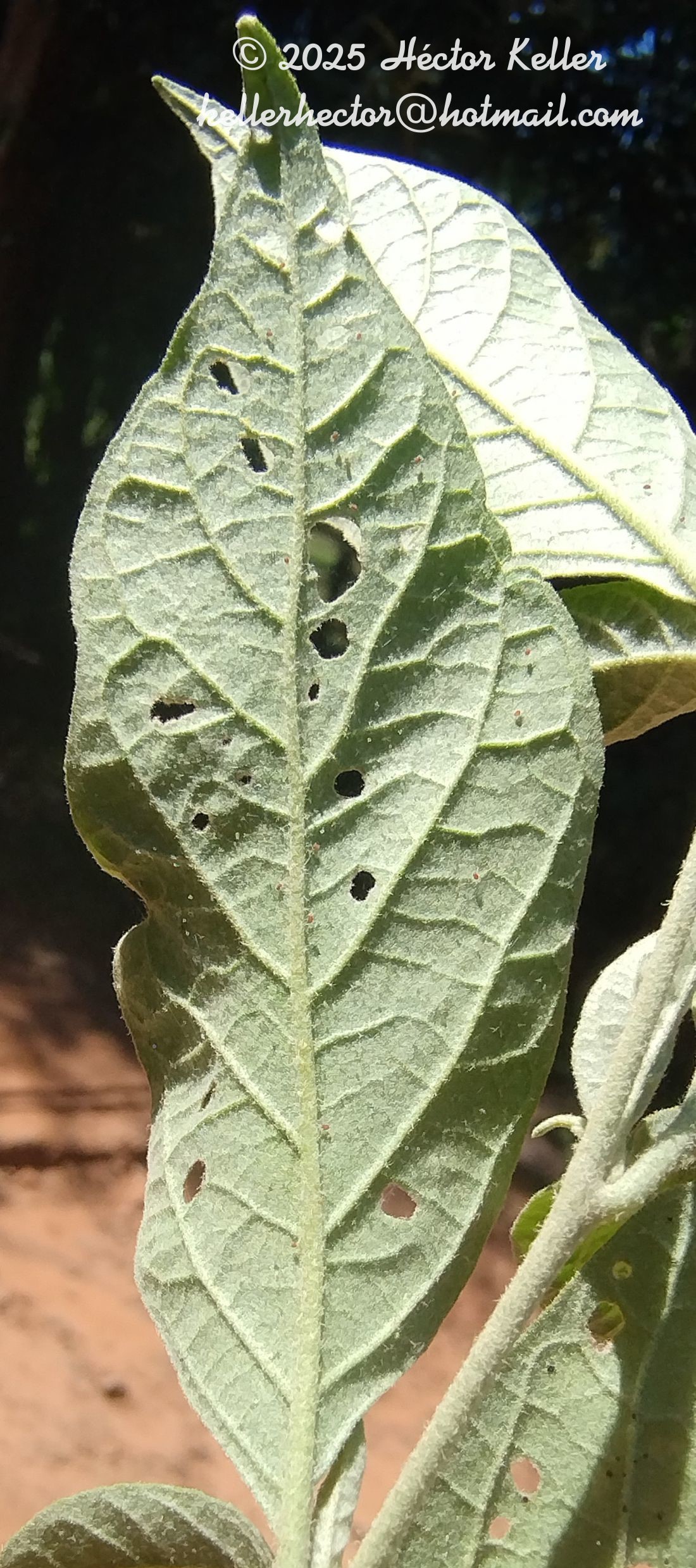 Arbustos hasta de 3 m de alto; tallos con tricomas ramificados y estrellados, sésiles o con pie corto a largo. Hojas desigualmente geminadas; pecíolos de 3-15 mm; láminas elípticas, las más grandes de 3,3-11,5 × 1-5,2 cm, las pequeñas de 1,2-3,9 × 0,6-2,3 cm, base cuneada a atenuada, ápice largamente acuminado, con indumento igual que el del tallo, discoloras; epifilo verde pardo a verde oliva; hipofilo verde oliva claro a verde-amarillento; hojas axilares ausentes. Inflorescencia axilar, ramificada varias veces, pluriflora, con 15-40 flores; pedúnculos de 1,2-2,2 cm. Pedicelos de 5-12 mm; cáliz de 2,5-3(-4) mm, partido hasta la mitad de su longitud, en el exterior con tricomas ramificados y glandulares, en el interior sólo con tricomas glandulares, lóbulos ovados, ca. 1,25 mm, obtusos; corola pentagonal, de 12-18 mm de diámetro, 12-15 mm de largo, excediendo la longitud del cáliz, blanca; filamentos de 0,8-1 mm, anteras ca. 3,5 mm; ovario glabro, estilo de 4,5 mm, superando la longitud del androceo. Baya de 5-10 mm, negruzca, morada, glabra; semillas de 2 × 1,75 mm.