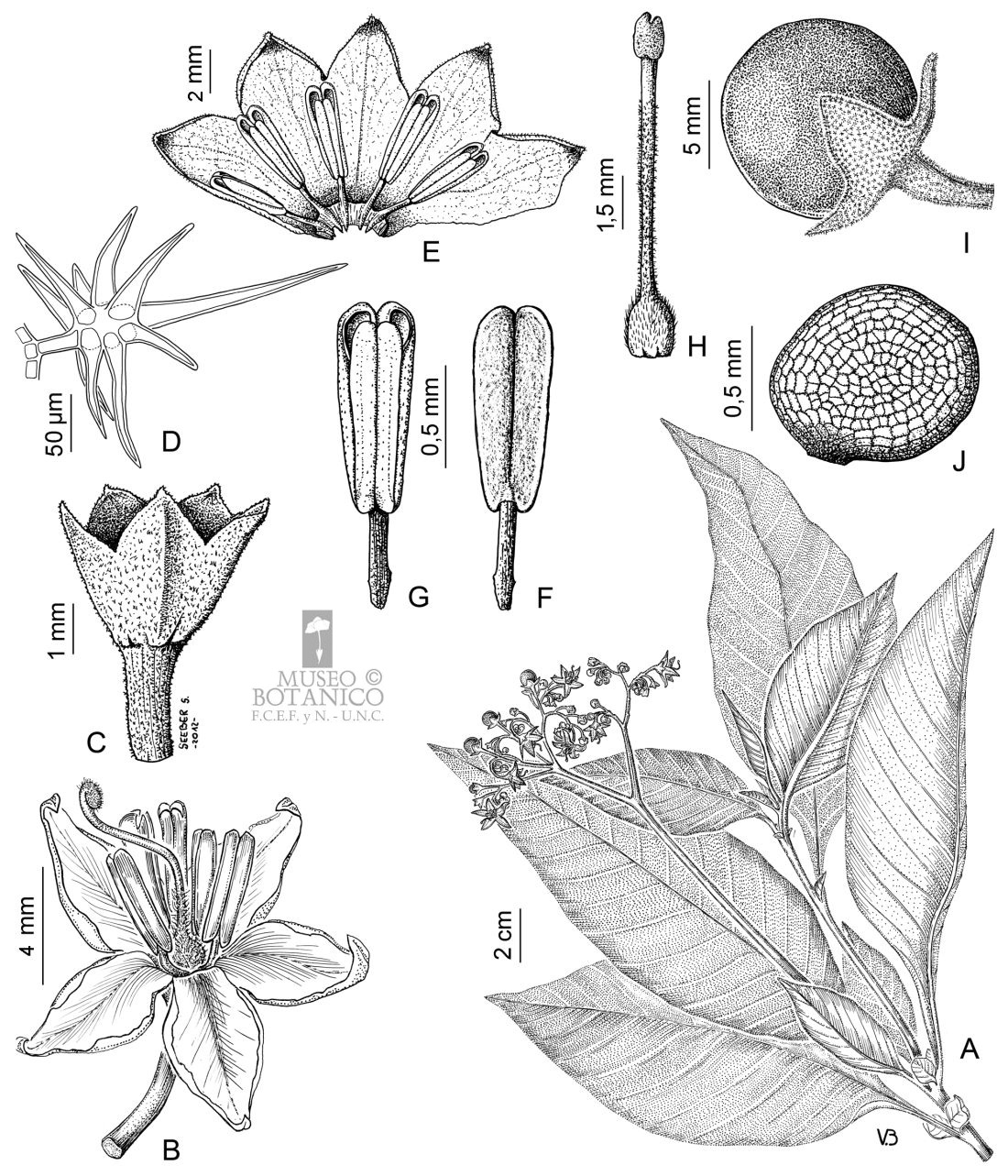 A. Rama con flores y frutos. B. Flor. C. Cáliz. D. Tricoma equinoide estipitado del cáliz. E. Corola desplegada. F. Estambre, vista dorsal. G. Estambre, vista ventral. H. Gineceo. I. Fruto. J. Semilla.