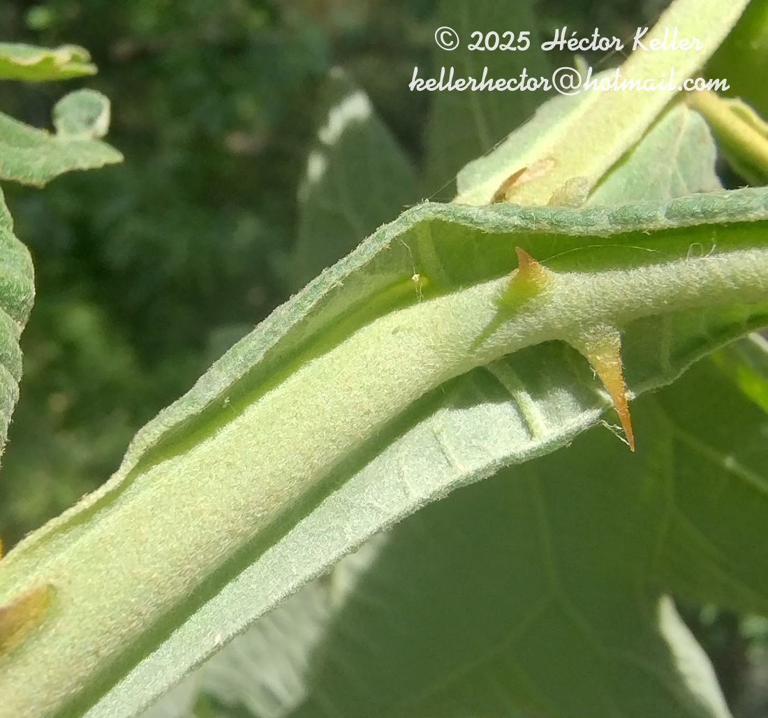 Arbustos andromonoicos hasta de 2 m de alto; tallos herbáceos o leñosos, cubiertos de tricomas estrellados corta a largamente estipitados y acúleos aplanado-recurvos. Hojas con pecíolos alados y acúleos subaciculares; láminas subenteras o con 2-4 lóbulos triangulares poco pronunciados, ápice agudo, discoloras; epifilo oscuro, con tricomas esparcidos, estrellados, cortamente estipitados, con 5-8 rayos laterales y uno central de igual longitud; hipofilo más claro, con pubescencia densa de tricomas estrellados largamente estipitados, con 8 rayos laterales y uno central algo menor; ambas caras con aguijones subaciculares. Inflorescencia pedunculada, no ramificada, escorpioide, con unas (1-)3(-5) flores perfectas y (3-)8-15(-19) flores estaminadas. Cáliz inerme y piloso, lóbulos triangulares, agudos; corola estrellada, ca. 2 cm de diámetro, blanca; anteras de 7 mm, amarillas; ovario con tricomas simples eglandulares. Baya 3-4 por inflorescencia, globosa o algo deprimida, de 1,8 cm de diámetro, con pubescencia simple incluso en la madurez; semillas lenticulares, ca. 2 mm, castañas.